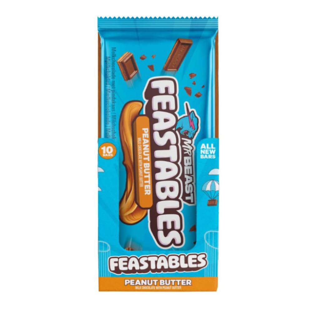 Discover MrBeast Feastables' luxurious peanut butter chocolate bars in a convenient 10-pack – the perfect chocolate gift for true chocolate lovers. Each bar (10 x 60g) combines delicious peanut butter with smooth milk chocolate for an unparalleled taste experience. The velvety texture of the milk chocolate and the creamy richness of the peanut butter blend together for an intense pleasure that speaks for itself. Our chocolate snacks combine the rich sweetness of peanut butter with the enticing, sugary note of milk chocolate that MrBeast fans adore. Ideal for any occasion, whether it's a sweet Christmas gift, a special birthday present, or simply a delicious snack between meals. The 10-pack of Feastables contains a selection of premium chocolates that will delight both classic chocolate lovers and fans of American-style treats. Whether you're looking for a small token for children or an exquisite indulgence for adults, this pack offers exactly what you need. Packaged in an elegant box, this selection of chocolates is not only a delight but also a stylish gift that is sure to impress. Enjoy the variety of MrBeast chocolate snacks and bring a little joy to the everyday lives of your loved ones. INGREDIENTS Milk chocolate 72 (sugar, whole milk powder, cocoa butter, cocoa mass, emulsifier (soy lecithin), natural vanilla extract), cocoa butter, 28 (peanuts, sugar, palm oil, salt) INSTRUCTIONS Experience the pleasure of taste by enveloping it directly in your mouth. Perfect for sharing with family and friends. See moreFeastables MrBeast Barre chocolatée au beurre de cacahuète 60 g x 10 - Soyez le premier à essayer la dernière barre - Idéal comme cadeau pour le petit déjeuner Noël et les fêtes d'anniversaireDESCRIPTION DU PRODUIT DESCRIPTION DU PRODUIT Découvrez les luxueuses barres chocolatées au beurre de cacahuètes MrBeast Feastables en pack pratique de 10 - le cadeau chocolaté idéal pour les vrais amateurs de chocolat. Chaque barre (10 x 60 g) associe un délicieux beurre de cacahuètes à un fin chocolat au lait et vous offre une expérience gustative incomparable. La texture veloutée du chocolat au lait et l'onctuosité du beurre de cacahuètes se fondent en un plaisir intense qui parle de lui-même. Nos snacks au chocolat combinent la riche douceur du beurre de cacahuètes avec la note séduisante et sucrée du chocolat au lait, dont raffolent les fans de MrBeast. Idéal pour toutes les occasions, qu'il s'agisse d'un cadeau sucré pour Noël, d'un cadeau d'anniversaire spécial ou tout simplement d'un délicieux snack entre deux repas. Le paquet de 10 Feastables contient une sélection de chocolats de qualité supérieure qui ravira aussi bien les amateurs de chocolat classique que les fans de friandises américaines. Que vous soyez à la recherche d'une petite attention pour les enfants ou d'une friandise exquise pour les adultes, ce pack vous offre exactement ce dont vous avez besoin. Emballé dans une élégante boîte, ce coffret de chocolats est non seulement un délice, mais aussi un cadeau élégant qui ne manquera pas de faire impression. Savourez la diversité des snacks au chocolat MrBeast et apportez un peu de bonheur dans le quotidien de vos proches. INGRÉDIENTS Chocolat au lait 72 (sucre, lait entier en poudre, beurre de cacao, pâte de cacao, émulsifiant (lécithine de soja), extrait naturel de vanille), beurre de cacao, 28 (cacahuètes, sucre, huile de palme, sel) MODE D'EMPLOI Découvrez le plaisir du goût en l'enveloppant directement avec la bouche. Idéal pour le partage avec votre famille et vos amis. Voir plus