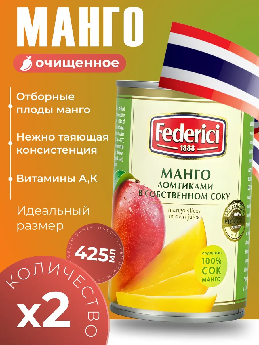 Манго Federici выпускается в удобной банке объемом 425 мл, сохраняя все полезные свойства и насыщенный вкус свежего фрукта.