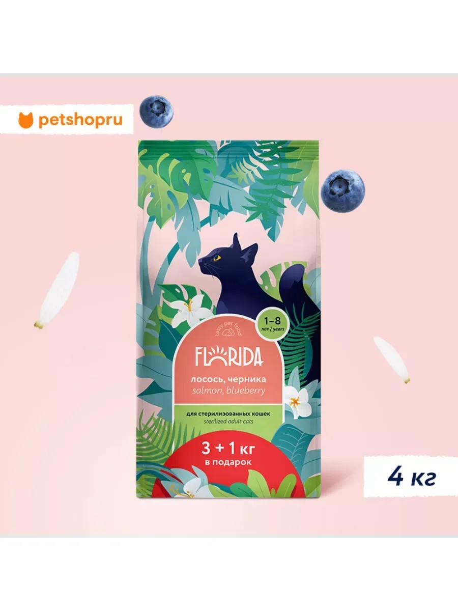 We recommend supplementing your pet's diet with Florida wet cat food in the following assortment: art. 86032090, art. 86029680, art. 86029020, art. 86030325, art. 86030780, art. 86035448. Florida Salmon & Blueberry is a super-premium dry food with salmon and blueberries for sterilized cats aged 1 to 8 years. Balanced complete nutrition cares for the skin and coat and promotes healthy digestion. Florida food contains only animal protein. Advantages of the food: natural antioxidants - berries, fruits