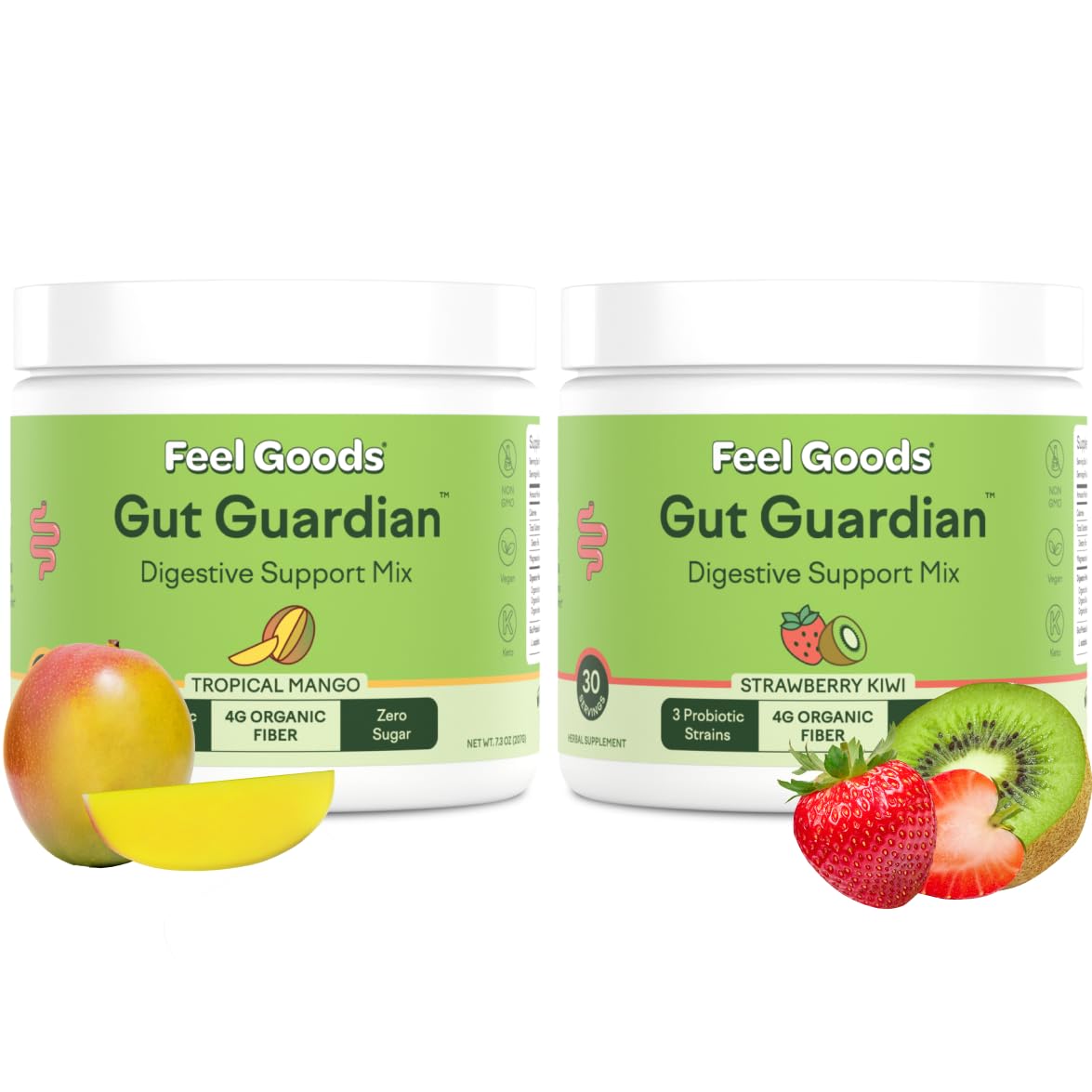 Feel Goods Gut Guardian Digestive Support Mix is a thoughtfully crafted blend of organic ingredients, including prebiotic fiber, probiotics, and L-glutamine, designed to support your digestive health naturally. Each serving delivers 4 billion live probiotics from three vital strains, along with a unique organic prebiotic complex to enhance your microbiome and optimize gut function. Ideal for daily use, it's a zero-sugar, non-GMO, and vegan-friendly mix that fits seamlessly into any wellness routine. The mix features key ingredients like organic inulin, organic guar fiber, and magnesium citrate, offering balanced nutrition to complement your lifestyle. Gut Guardian is conveniently packaged in single-serving packets, perfect for those on the go. Simply mix one to three servings with water or your favorite beverage, and enjoy the digestive benefits wherever life takes you. With a refreshing tropical mango flavor, Gut Guardian makes supporting your gut health a delicious experience. The light, easy-to-drink mix is also enriched with organic acacia, Jerusalem artichoke, and low-FODMAP guar bean to promote regularity and ease digestive discomfort. To help combat bloating, it includes organic lemon balm, ginger, and apple cider vinegar, offering a soothing way to relieve gas and support smooth digestion. Crafted without artificial flavors, sweeteners, or stevia, this digestive support drink mix is suitable for a variety of dietary preferences, including vegan, gluten-free, and organic lifestyles. Whether you're at home or on the move, Feel Goods Gut Guardian is your go-to solution for effective, clean digestive support.PURE AND SIMPLE INGREDIENTS CLEAN AND CRAFTED WITH CARE:Gut Guardian is crafted with clean, non GMO ingredients and contains no artificial flavors, sweetener, or stevia. The powerful probiotic and prebiotic blend is zero sugar, Non GMO, Vegan, Keto and tasty without any artificial ingredients. It's perfectly versatile to support the strictest dietary preferences while delivering optimal support. REFRESHING TROPICAL MANGO FLAVOR RADIATE ENJOY A TASTY DRINK IF STRAWBERRY KIWY: Savor the tropical taste of mango with every sip of Gut Guardian. This vibrant blend captures the sweetness of ripe mango, offering a refreshing and delicious way to support your wellness. el Goods Gut Guardian Strawberry Kiwi Mango. CONVENIENT FOR ON THE GO AND EASY TO USE SAY BYE BYE TO BLOAT: Packaged in single serving packets, Gut Guardian is perfect for those with busy, on the go lifestyles. el Goods Gut Guardian Strawberry Kiwi Mango. Activate your digestive system with Organic Lemon Balm, Ginger, and Apple Cider Vinegar to help combat the feeling of your belly ballooning and the discomfort of gas, allowing you to finally savor your favorite meals. BALANCED NUTRITION FOR DAILY USE FEEL SMOOTH DIGESTION: Each serving of Gut Guardian provides a balanced mix of key ingredients like organic inulin, organic guar fiber, and magnesium citrate. One refreshing drink has 4,000 mg of organic soluble fiber to support more regular bowel movements. It uses Organic Acacia, Jerusalem Artichoke, and low-FODMAP Guar Bean to gently promote regularity and alleviate digestive discomfort. DIGESTIVE SUPPORT WITH ORGANIC INGREDIENTS BALANCE GUT HEALTH: Feel Goods Gut Guardian Digestive Support Mix is carefully crafted with a blend of organic prebiotic fiber, probiotics, and L glutamine to support your digestive system. Gut Guardian by Feel Goods makes your gut happy with 4 billion live probiotics from 3 vital strains. And unlike most probiotics, it includes an organic prebiotic complex to properly support your microbiome.