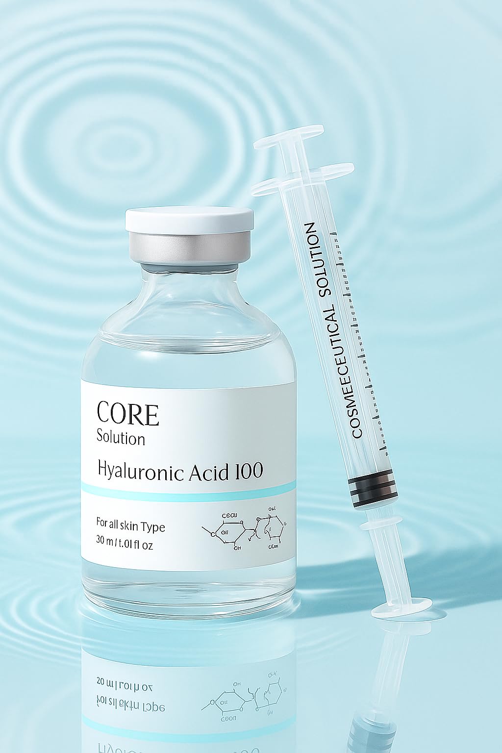 Hyaluronic Acid 100 ampoule with label and ingredient callouts for deep hydration and skin support