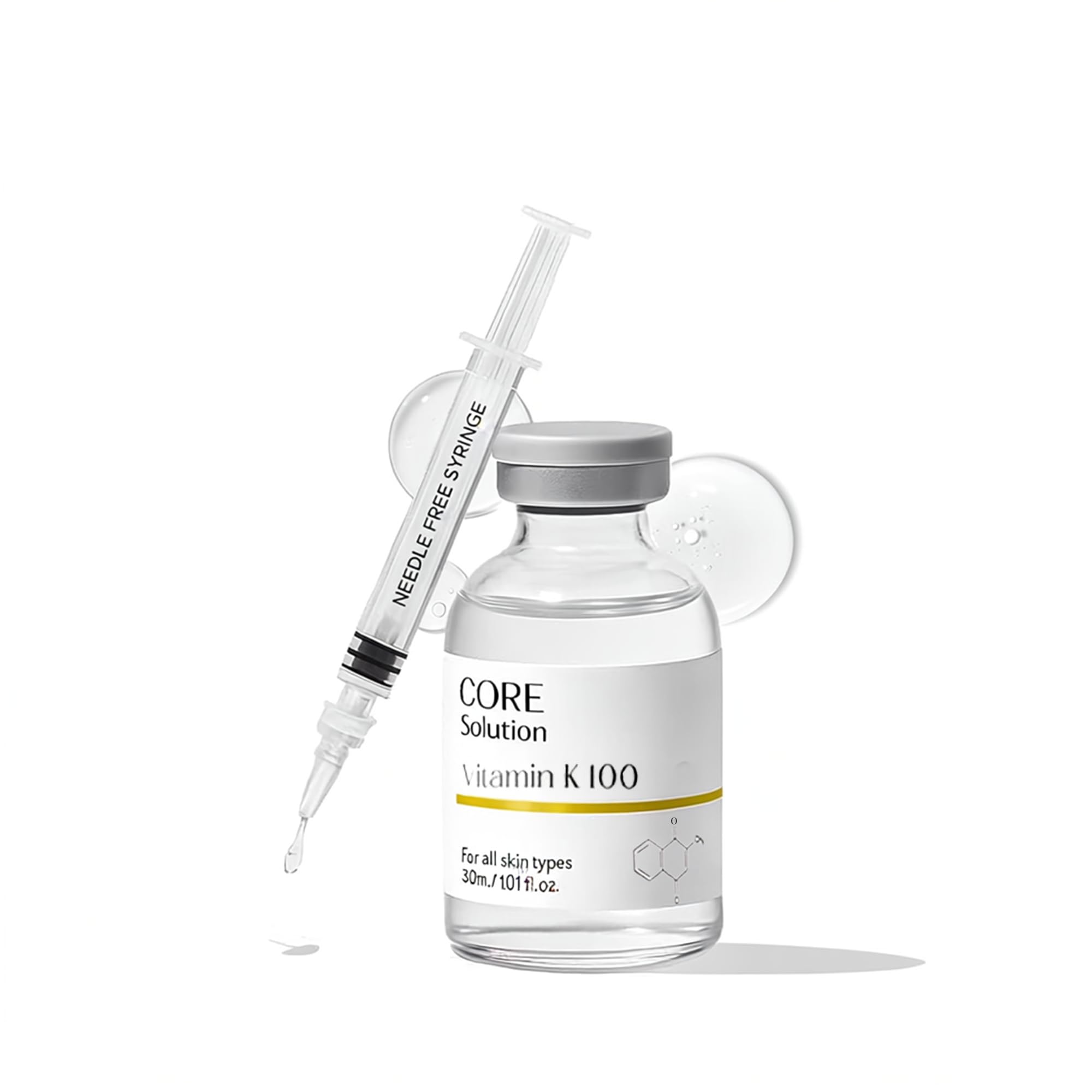 Vitamin K 100 ampoule with ingredient callouts for redness relief, dark circles, and skin repair