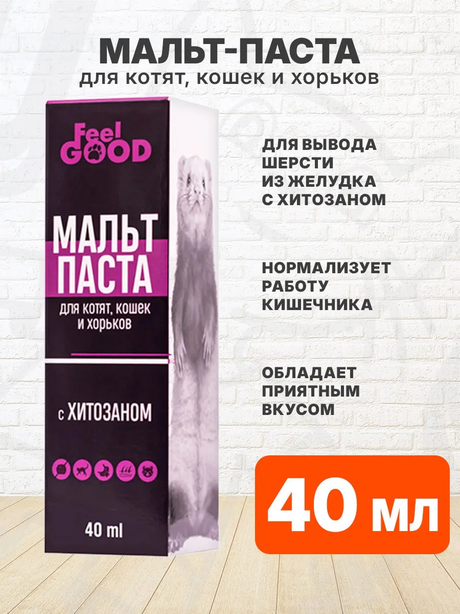 Мальт-паста FeelGOOD — это гигиеническое средство для естественного очищения желудочно-кишечного тракта кошек от проглоченной после вылизывания шерсти (безоаров). Улучшенная формула с хитозаном разрушает безоары и стимулирует перистальтику кишечника, увеличивая продвижение волосяных комочков по кишечнику, тем самым предотвращая угрозу закупорки кишечника.