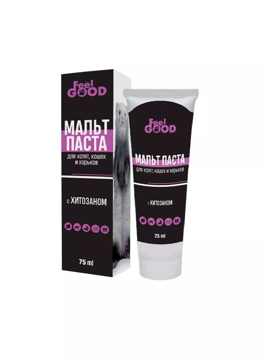 Мальт-паста FeelGOOD — это гигиеническое средство для естественного очищения желудочно-кишечного тракта кошек от проглоченной после вылизывания шерсти (безоаров). Улучшенная формула с хитозаном разрушает безоары и стимулирует перистальтику кишечника, увеличивая продвижение волосяных комочков по кишечнику, тем самым предотвращая угрозу закупорки кишечника. Положительные эффекты на здоровье домашних животных при ежедневном употреблении мальт-пасты FeelGOOD:разрушение трихобезоаров происходит благодаря проникновению хитозана в структуру волосяного комочка с его последующим разрыхлением; безболезненное передвижение трихобезоаров по желудочно-кишечному тракту, благодаря усилению перистальтики кишечника; предотвращение формирования в желудке и кишечнике волокноподобных конгломератов и дальнейшей угрозы закупорки кишечника; укрепление и поддержание здоровья эпидермиса и его производных, обеспечение густоты и блеска шерсти; улучшенная вкусовая и ароматическая композиция усиливает привлекательность продукта.
