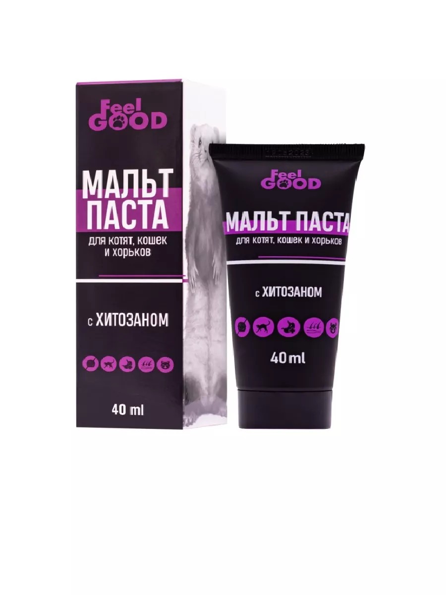 Мальт-паста FeelGOOD — это гигиеническое средство для естественного очищения желудочно-кишечного тракта кошек от проглоченной после вылизывания шерсти (безоаров). Улучшенная формула с хитозаном разрушает безоары и стимулирует перистальтику кишечника, увеличивая продвижение волосяных комочков по кишечнику, тем самым предотвращая угрозу закупорки кишечника. Положительные эффекты на здоровье домашних животных при ежедневном употреблении мальт-пасты FeelGOOD:разрушение трихобезоаров происходит благодаря проникновению хитозана в структуру волосяного комочка с его последующим разрыхлением; безболезненное передвижение трихобезоаров по желудочно-кишечному тракту, благодаря усилению перистальтики кишечника; предотвращение формирования в желудке и кишечнике волокноподобных конгломератов и дальнейшей угрозы закупорки кишечника; укрепление и поддержание здоровья эпидермиса и его производных, обеспечение густоты и блеска шерсти; улучшенная вкусовая и ароматическая композиция усиливает привлекательность продукта.