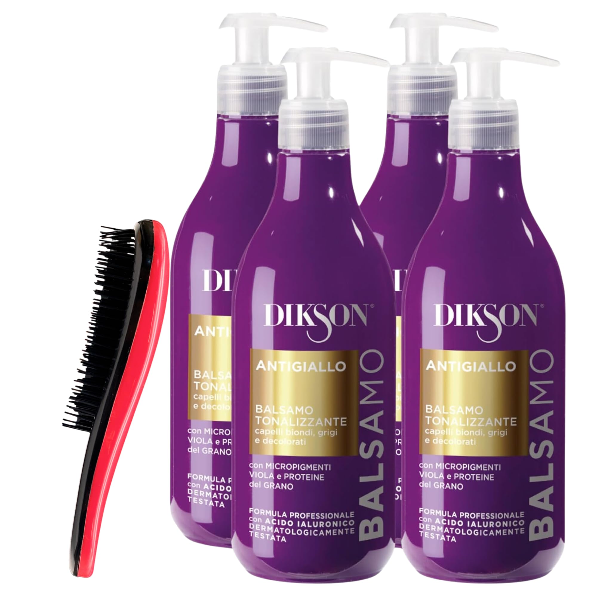 Anti-yellowing, toning balm for blonde, gray, and bleached hair. With violet micro-pigments and wheat proteins. Professional formula with hyaluronic acid. Formulated with violet micro-pigments and wheat proteins, it neutralizes unwanted yellow tones and complements the action of the shampoo, leaving hair soft, shiny, and silky. Effectively detangles, nourishing and moisturizing weakened hair, making it strong, full, and resilient. 500 ml. Product design may vary. INGREDIENTS Violet micro-pigments and wheat proteins. Hyaluronic acid DIRECTIONS Apply the balm to wet hair, avoiding the scalp. Leave on for a few minutes, then rinse thoroughly. Use approximately 15 to 30 ml of product per application, depending on hair length and thickness. SAFETY WARNING Avoid contact with eyes See moreProduct design may vary. Generous size: Packaged in a 500ml bottle, this balm provides a large amount of product, ensuring long-lasting and convenient use to keep blonde, gray, or bleached hair looking its best. ? SHINY AND SMOOTH: In addition to neutralizing yellow tones, this balm leaves hair shiny and silky. Its complete action in shampoo helps keep hair bright and healthy. Detangles and moisturizes: Its formula is designed to effectively detangle hair, making it more manageable and easier to style. It also moisturizes depleted hair, reducing the risk of dryness and damage. Wheat Proteins and Hyaluronic Acid: Enriched with wheat proteins and hyaluronic acid, this balm provides a moisturizing and nourishing treatment for hair. These ingredients work to strengthen hair, making it soft, full, and resilient. Toning formula: Contains violet micro-pigments that neutralize unwanted yellow tones in blonde, gray, and bleached hair. This helps maintain a fresh and luminous shade.Après-shampoing Anti-Jaune, Tonalisant, pour cheveux blonds, gris et décolorés, avec micropigments violets et protéines de blé. Formule professionnelle avec acide hyaluronique 500 ml (4 flacons)DESCRIPTION DU PRODUIT DESCRIPTION DU PRODUIT Baume anti-jaune, tonalisant, pour cheveux blonds, gris et décolorés. Avec micropigments violets et protéines de blé. Formule professionnelle avec acide hyaluronique. Formulé avec des micropigments violets et des protéines de blé neutralise les reflets jaunes indésirables, et complète l'action du shampooing en laissant les cheveux doux, brillants et soyeux. Démêle efficacement, en nourrissant et hydratant les cheveux appauvris, les rendant forts, corps et résistants, 500 ml. Le motif du produit peut varier INGRÉDIENTS Micropigments violets et protéines de blé. Acide hyaluronique MODE D'EMPLOI Appliquer le baume sur cheveux mouillés, en évitant le cuir chevelu. Laisser poser pendant quelques minutes, puis rincer abondamment. Utilisez environ 15 à 30 ml de produit par application, en fonction de la longueur et de l'épaisseur des cheveux. AVERTISSEMENT DE SÉCURITÉ Évitez tout contact avec les yeux Voir plusLe motif du produit peut varier. Format généreux : emballé dans un flacon de 500 ml, ce baume offre une grande quantité de produit, assurant une utilisation prolongée et pratique pour garder les cheveux blonds, gris ou décolorés toujours au mieux de leurs conditions. ? BRILLANT ET SÉTÉ: En plus de neutraliser les reflets jaunes, ce baume laisse les cheveux brillants et soyeux. Son action complète au shampooing aide à garder les cheveux lumineux et sains. Démêle et hydratée : sa formule est conçue pour démêler efficacement les cheveux, les rendant plus gérables et faciles à coiffer. En outre, hydrate les cheveux appauvris, réduisant le risque de sécheresse et de dommages. Protéines de Gran et Acide Hyaluronique : Enrichi en protéines de blé et en acide hyaluronique, ce baume offre un traitement hydratant et nourrissant pour les cheveux. Ces ingrédients travaillent pour renforcer les cheveux, les rendant doux, corps et résistants. Formule tonalisante : contient des micropigments violets qui neutralisent les reflets jaunes indésirables dans les cheveux blonds, gris et décolorés. Cela aide à garder une teinte fraîche et lumineuse.