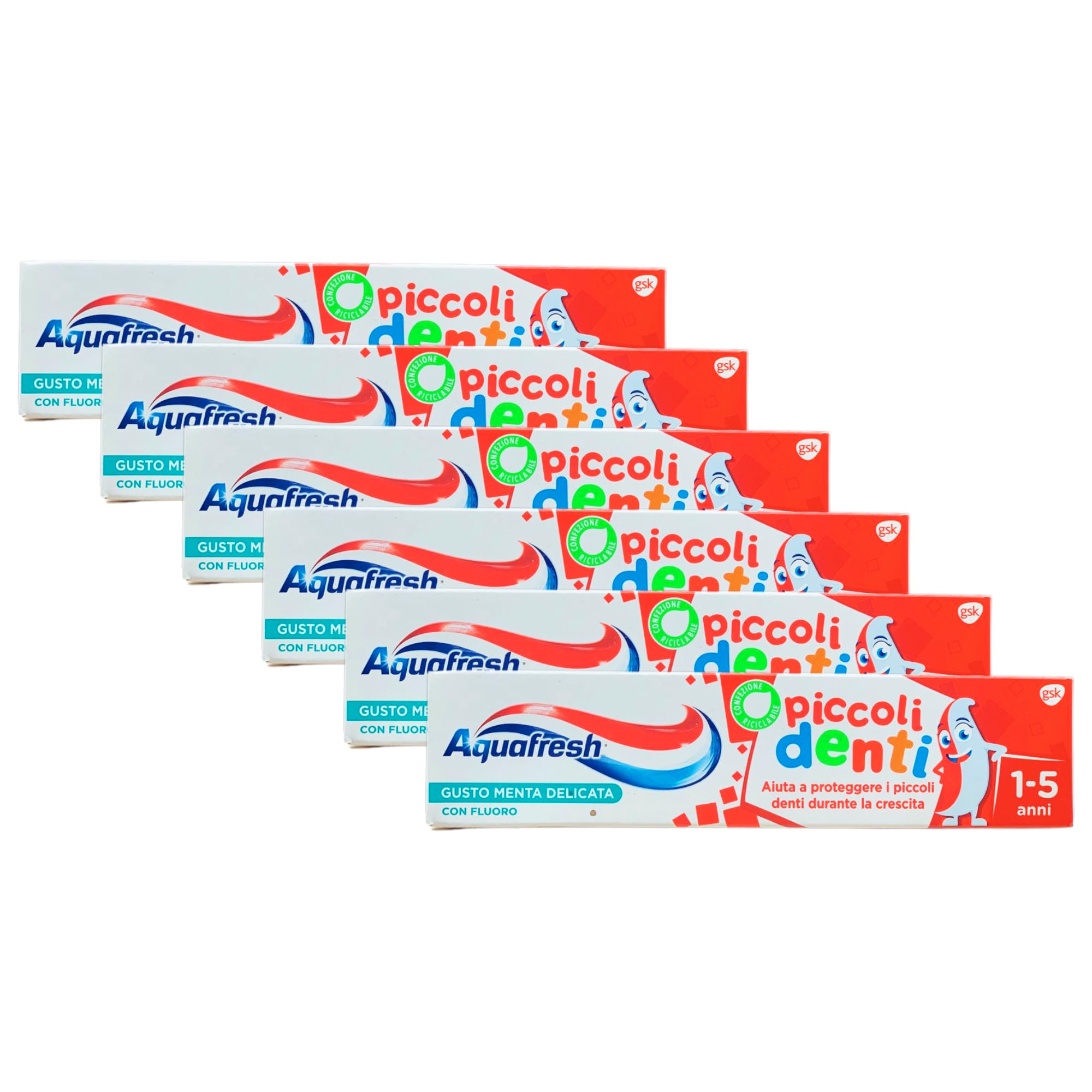 Product design may vary. 50ml size: 50ml tube, ideal for daily use and to support the growth of little teeth. Gentle cleaning and low abrasion: low-abrasive formula to gently clean teeth without damaging the enamel, perfect for children's sensitive gums. With fluoride: provides 24-hour protection against sugar acids thanks to fluoride, which helps prevent cavities and strengthens enamel. Delicate mint flavor: a light and pleasant mint flavor that makes brushing more enjoyable for little ones, encouraging them to take care of their teeth. Pack of 6 small toothpastes: toothpaste specifically formulated for children aged 1 to 5 years, designed to protect growing teeth and ensure gentle and safe oral hygiene.