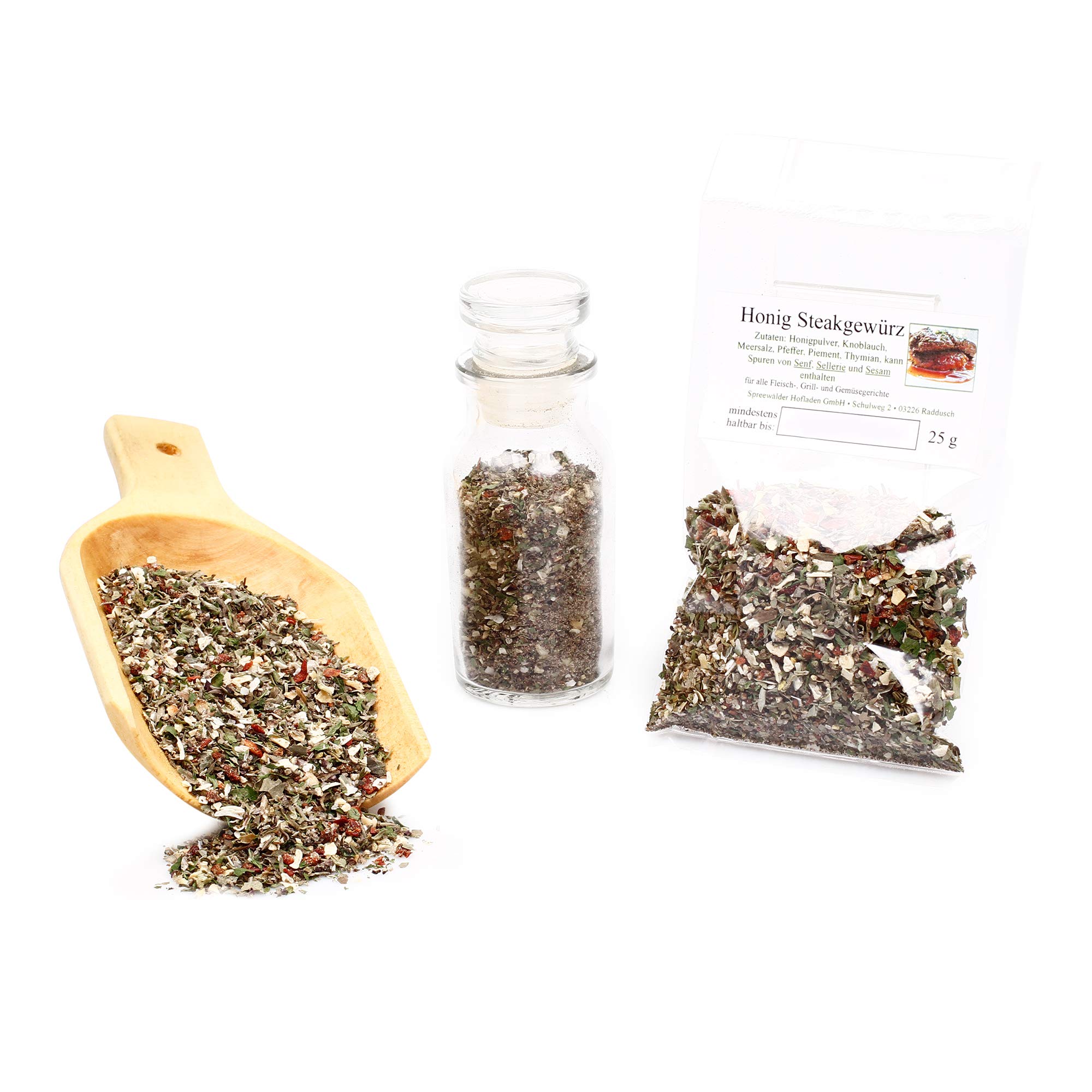 Fine spices and honey for barbecue. Enhance American-style meat dishes with honey. In the United States, a steak is seasoned in two different ways: the classic salt and pepper, or two slices of meat or even a whole roast are marinated and finished with a spice blend. This steak pepper and spicy spice blend will add a kick to your steak or roasts. Perfect pepper blend for seasoning meat dishes. The mild flavor makes this honey barbecue blend also ideal for those who don't like spicy food. Try grilled or roasted steaks with this spice blend that will win you over with its flavor. Only the finest natural ingredients are used in this steak seasoning. Perfect for enjoying classic American steaks and honey sauce. Recipe: American marinade. Ingredients: 2 cloves of garlic, 3 tablespoons of honey, 1 tablespoon of chili powder, 2 tablespoons of olive oil, 2 bay leaves, 1 4 teaspoon of cinnamon, 1 4 cup of brown sugar, 6 tablespoons of lemon juice, 3 tablespoons of cornstarch, 1 tablespoon of Tabasco sauce, 2 tablespoons of white vinegar, 1 cup of oil. This recipe is enough for 4 x 200g steaks or 800g of chicken (or other poultry cuts). Preparation: Mince the garlic cloves and whisk together all the other ingredients except the oil. Let it infuse for a few minutes. Carefully pour in the oil and transfer the marinade to a freezer bag. Marinate the poultry, pork, or beef steaks overnight in the refrigerator. Alternatively, place on a charcoal grill or in the oven.Miel Steak Mélange d'épices Epices à steak avec véritable poudre de miel Epices de barbecue sans amplificateur de goût 25 gDESCRIPTION DU PRODUIT Épices fines et miel au barbecue. affiner les plats de viande de type américain avec des omes de miel. Aux États-Unis, un steak est assaisonné de deux façons différentes : la variante classique avec sel et poivre, la variante deux tranches de viande ou même un rôti entier sont marinés et affinés avec un mélange d'épices. Le mélange de poivre à steak et d'épices épicés épicera votre steak ou vos rôtis. Mélange de poivre parfait pour assaisonner les plats de viande. L'épicerie douce rend ce mélange de barbecue miel également idéal pour les personnes qui n'aiment pas les plats tranchants. Essayez des steaks grillés ou rôtis avec ce mélange d'épices qui vous convaincra plus que de saveurs. Seuls les meilleurs ingrédients naturels sont utilisés pour cette épicerie à steak. Parfait pour déguster des steaks américains typiques et de la sauce au miel. Recette : marinade américaine. Ingrédients : 2 gousses d'ail, 3 cuillères à steak de miel, 1 cuillère de piment en poudre, 2 cuillères à soupe, 2 cuillères à soupe, 2 feuilles de laurier, 1 4 cuillère à cannelle, 1 4 tasse de sucre brun, 6 cuillère à jus de citron, 3 sauce de travail, 1 cuillère à tabasco, 2 cuillères à soupe blanches. vinaigaigre ou vinaigre 1 tasse d'huile. Les ingrédients sont suffisants pour 4 x 200 g de steak ou 800 g de poulet (autres pièces de volaille). Préparation : hacher les gousses d'ail et mélanger avec tous les autres ingrédients sauf l'huile avec un fouet et et laisser infuser quelques minutes. Versez soigneusement l'huile en quantité et versez la marinade dans un sachet congélateur. Placez la volaille ou vos steaks porcins et bovins pendant la nuit et conservez-les au réfrigérateur. Placer sur le barbecue au charbon de bois ou au four.