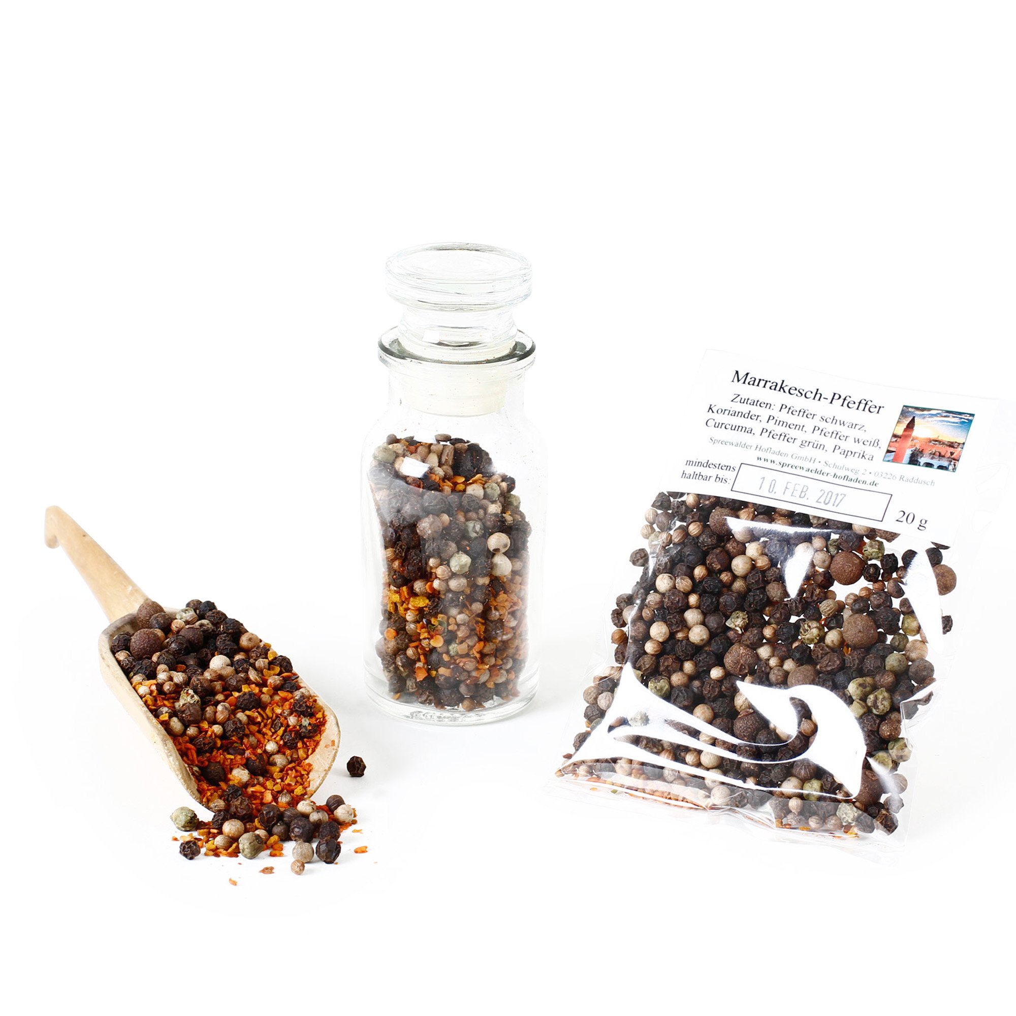 This salad seasoning is undoubtedly one of the finest pepper blends available. The colorful mix of premium green, white, and black peppercorns will not only delight your palate and eyes, but also enhance your table and spice rack. This complex pepper blend is perfectly complemented by bell peppers, turmeric, chili pepper, and coriander. It adds wonderful flavor to a wide variety of dishes, from Asian and North African cuisine to sauces, fish, and vegetable specialties. This aromatic pepper blend is perfect for all kinds of savory dishes you can garnish and enjoy it anytime with this excellent mix of peppers and spices. 1. Recipe Suggestions. Marrakech Chicken Salad Ingredients: 200g roasted chicken, 2 oranges, 1 cup sour cream, 1 tbsp mango chutney, 1 tbsp ketchup, 1 tbsp Marrakech pepper. Preparation: Cut the still-warm chicken into manageable pieces. Next, peel and segment the oranges, then add them to the chicken. Add ketchup, crème fraîche, mango chutney, and a Marrakech pepper blend. Mix everything together carefully. Serve with couscous or bread! 2. Recipe Suggestion: Marrakech Vinaigrette! Ingredients: 6 tablespoons olive oil, 4 tablespoons balsamic vinegar, 1-2 tablespoons mustard fig, a pinch of salt, and Marrakech pepper. Preparation: Mix all the ingredients together thoroughly and chill. Your refreshing Marrakech vinaigrette is ready for salads and also as a marinade for grilled meats and seafood. INGREDIENTS: black peppercorns, coriander, chili pepper, white pepper, turmeric, green peppercorns, black pepperMarrakech pepper refill in multicolored peppercorns, with magnificent hues, a unique spice in every kitchen. The mild-tasting spice contains a high amount of essential oil and has an appetite-stimulating and digestive effect. This colorful pepper is fully decorated with white and green peppercorns in a balanced blend for superb recipe ideas. The vibrant spice mix enhances many dishes. Colored pepper for black pepper mills. Gourmet pepper blend enriched with bell peppers, coriander, turmeric, and chili pepper. The selected spices bring a special oriental kick to this Deluxe Pepper refill. Moroccan Spice Blend - African Pepper - A feast for the eyes, ideal for tasting and as a decorative finishing touch as a table spice. Rich in facets with peppery and sweet aromas, an exceptional taste for many recipes, a must-have in every kitchen. Vibrant Marrakech pepper from the African coast, refined with cloves, also known as Jamaican pepper. A blend of aromatic and pungent spices, in a balanced selection of the finest ingredients, for a delicate peppercorn flavor with an intense spice strength to enhance a variety of dishes. A natural product with an authentic taste for your spice rack.Marrakesch Poivre complet coloré pour moulin à poivre noir, poivre blanc, poivre, vert, curcuma, spécialité du poivre, piper nigrum, 20 gDESCRIPTION DU PRODUIT DESCRIPTION DU PRODUIT L'assaisonnement de salades est sans doute l'un des mélanges de poivre les plus nobles disponibles. Le mélange coloré de poivres verts, blancs et noirs de qualité supérieure apportera non seulement une variété à votre palais et vos yeux, mais aussi à votre table et à votre étagère à épices. Ce mélange de poivre complexe est parfaitement raffiné avec du poivrons, du curcuma, du piment et de la coriandre. De magnifiques plats orientaux, des plats du Nord de l'Afrique et aussi des sauces, des poissons et des spécialités de légumes ont un goût merveilleux. Le mélange aromatique de poivre pour des plats salés de toutes sortes, vous pouvez garnir et déguster à tout moment avec cet excellent mélange de poivres et d'épices. 1. Suggestions de recettes. Salade de poulet Alla Marrakech Ingrédients : 200 g de poulet rôti, 2 oranges, 1 tasse de crème fraiche, 1 EL Mango Chutney, 1 EL Ketchup, 1 cuillère à poivre Marrakech. Préparation : couper les morceaux de viande de poulet encore chauds en morceaux acceptables. À l'étape suivante, les oranges sont pelées et filetées soigneusement et ajoutées à la viande. Ketchup, crème fraiche, mangue Chutney et mélange de poivre Marrakech. Mélangez et alignez tout soigneusement. Ajoutez un peu de couscous ou du pain à cela ! 2. Suggestion de recettes : vinaigrettes Marrakech ! Ingrédients : 6 cuillères à soupe d'huile d'olive, 4 cuillères à soupe de citron balsamique, 1 à 2 cuillères de figue moutarde, un peu de sel et de poivre Marrakech. Préparation : mélangez soigneusement tous les ingrédients entre eux et refroidir. Votre vinaigrette rafraîchissante Marrakech est prête pour les salades et aussi comme marinade pour la viande grillée et les fruits de mer. INGRÉDIENTS grains de poivre noir, corinandre, piment, poivre blanc, curcuma, poivre vert, poivreRecharge de poivre Marrakech en grains de poivre multicolores, avec de magnifiques nuances, une épices unique dans chaque cuisine. L'épices au goût doux contient beaucoup d'huile essentielle et a un effet stimulant l'appétit et digestif. Poivre coloré entièrement décoré avec du poivre épicé blanc et du poivre vert dans un mélange équilibré pour de superbes idées de recettes. Le mélange d'épices très coloré met en valeur de nombreux plats. Poivre coloré pour moulin à poivre noir. Mélange de poivre gourmet enrichi de poivrons, coriandre, curcuma et piment. Les épices sélectionnées apportent un coup de fouet oriental particulier dans cette compensation Deluxe Poivre. Mélange d'épices du Maroc Poivre d'Afrique - Un régal pour les yeux idéal pour déguster et les finitions décoratives comme épices de table. Riche en facettes avec des arômes poivrés et sucrés, un goût exceptionnel pour de nombreuses recettes, ne devrait manquer dans aucune cuisine. Poivre de Marrakech très coloré de la côte du poivre africain affiné avec des clous de girofle, également connu sous le nom de poivre Jamaïque. Mélange d'épices aromatiques et aiguisées, dans une sélection é