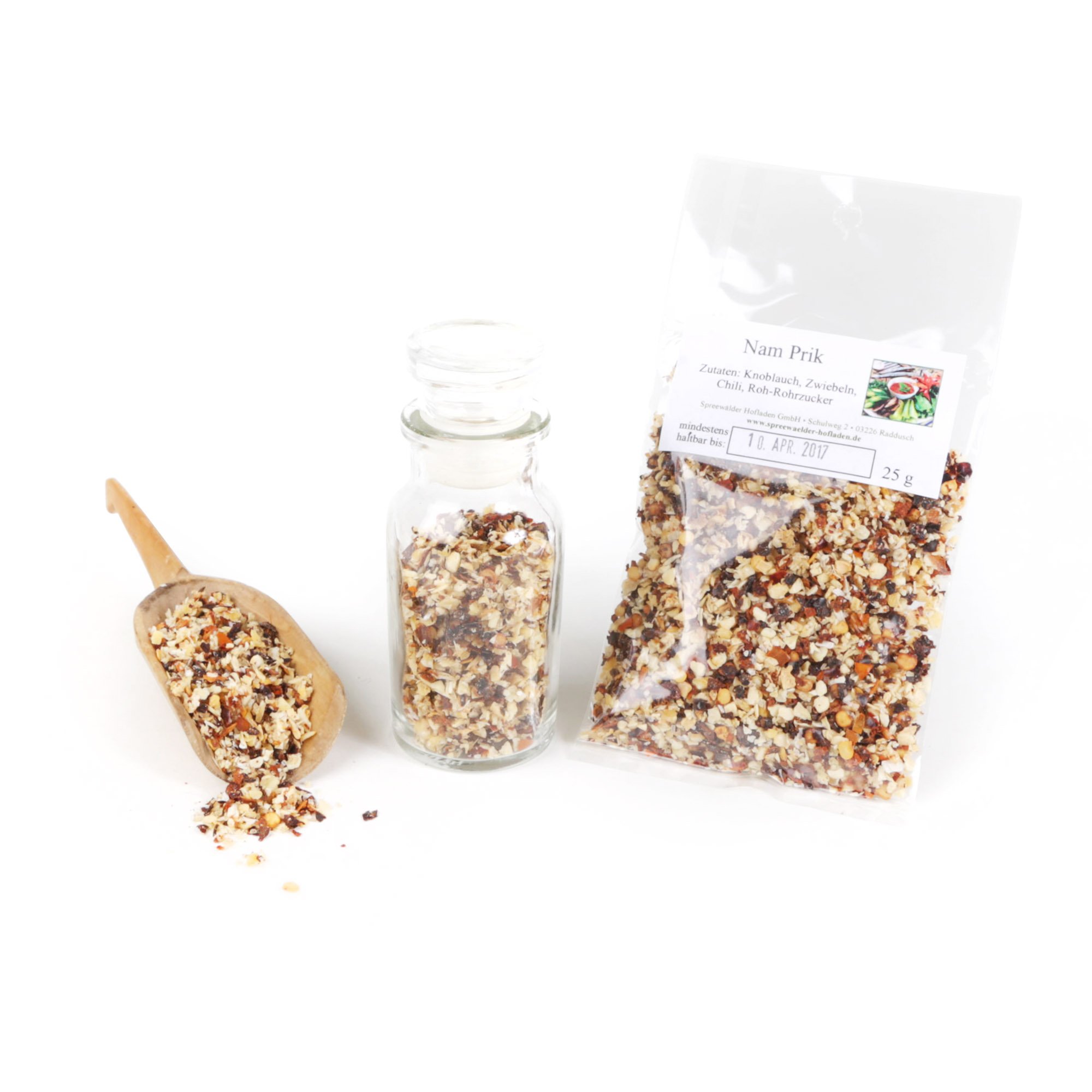 Fine Thai spice blend. Extraordinary chili paste - Ideal for powerful marinades. The taste of Nam Pirk is perhaps the easiest to achieve with a sweet and spicy kick, featuring a noticeably strong garlic note, and pairs beautifully with fish sauce. Recipe: Nam Pirk Phau Thai Chili Spice Blend Ingredients: 10 shallots, 10 garlic cloves, 200g crabmeat, 125ml vegetable oil, 100g dried chili, 2 tablespoons palm sugar, 3 tablespoons tamarind powder. Preparation: Peel and finely chop the shallots and garlic. Grind the crabmeat, preferably in a mortar and pestle or a suitable food processor. Now, heat the oil in a small frying pan and roast the carrots, garlic cloves, and even the chili peppers over low heat. Then, immediately remove them from the pan and let the fat drain or spread them out on paper towels. The mixture needs to cool sufficiently before the next step, as everything in the mortar is now ground into a fine paste. The powdered mixture is now returned to the hot oil with the crabs, and everything is briefly roasted again. Next, add the fish sauce, palm sugar, and tamarind, stirring thoroughly. Let it cool (sprinkle with finely chopped kaffir lime leaves). Nam Prik Phau can be used with various vegetables or even cooked eggs. This basic seasoning serves as a spicy base in many curries and other Thai dishes. The sauce can be stored for a month in the refrigerator and can also be used as a barbecue sauce. INGREDIENTS Garlic, onions, chili pepper, raw cane sugarNam Prik Thaï Asia Gourmet Mélange d'épices asiatiques pour pâte à piment, épices, poissons, sauces, soupes et sauces, sans gluten, 25 gDESCRIPTION DU PRODUIT DESCRIPTION DU PRODUIT Mélange d'épices fines de thaïlandais. Pâte de piment extraordinaire - Idéale pour les marinades puissantes. Le goût de Nam Pirk est probablement le plus facile que le sucré piqué avec une note d'ail sensiblement forte et est très volontiers complété avec de la sauce à poissons. Recette : mélange d'épices thaïlandaises de piment Nam Prik Phau Ingrédients : 10 écharotes, 10 gousses d'ail, 200 g de crabe, 125 ml d'huile végétale, 100 g de piment séché, 2 cuillères à sucre de palmier, 3 cuillères à tamarindénme de tamarin. Préparation : les échalottes et l'ail doivent être épluchés et finement coupés. Broyez les crabes, de préférence dans un mortier ou un robot de cuisine approprié. Maintenant, l'huile peut être chauffée dans une petite poêle à frire et les écarottes, gousses d'ail et même les chouettes de piment peuvent être rôtis à basse température. Puis sortez immédiatement des poêles et laissez la graisse s'égoutter ou étalez sur du papier essuie-tout. Le mélange doit refroidir suffisamment avant la prochaine étape de travail, car maintenant tout dans le mortier est écrasé en une masse fine. Le mélange poudre est maintenant à nouveau dans l'huile chaude avec les crabes, tout est encore une fois rôti brièvement. En outre, vous devez ajouter la sauce de poisson, le sucre de palmier et le tamarindme et tout en profondeur. Refroidissement (saupoudrer avec des feuilles de citron finement découpées). Nam Prik Phau s'adapte à différents légumes ou éventuellement œufs cuits. Ces assaisonnements de base servent de base épicée dans de nombreux plats au curry et autres plats thaïlandais. La sauce se conserve un mois au réfrigérateur et peut également être utilisée comme sauce pour barbecue. INGRÉDIENTS Ail, oignons, piment, sucre de canne brut
