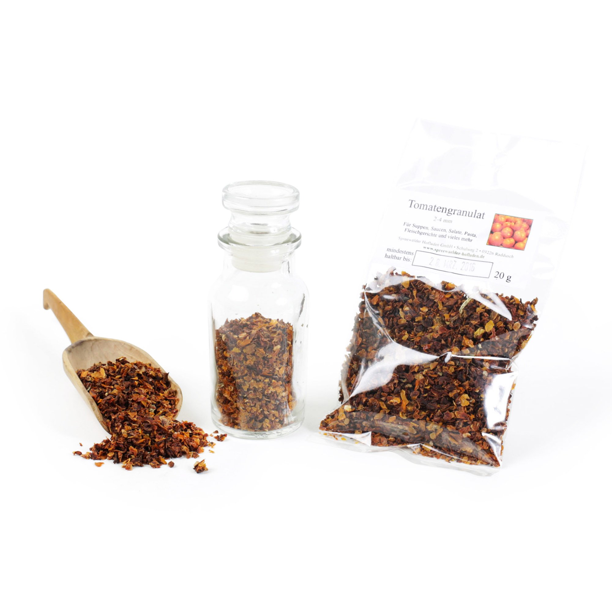 Fine Tomato Granules These premium quality tomato granules have a medium grain size of 2 to 4 mm. Their vibrant red color and unmistakable tomato flavor make them the perfect seasoning for sauces, pasta, rice, soups, gravies, and various vegetables. Even festive roasts or other meat dishes can be enhanced with this modern spice. These sun-ripened tomato granules contain all the components of ripe tomatoes. They are rich in vitamins A, B1, B2, C, and E, as well as important minerals such as potassium and trace elements. This 100 tomato spice is an essential element of sophisticated, modern cuisine. Recipe: Vegetarian Bolognese Ingredients: 100g soy granules (prepared according to package instructions), 3 tbsp olive oil, 1 onion, 3 cloves garlic, 750g mixed soup vegetables (carrots, celery, parsley root, pear), 3 tbsp tomato paste and or tomato pulp, 3 cans (425ml) chopped tomatoes, thyme, thyme, bay leaves, salt, and pepper. Preparation: Finely chop the onion and garlic and sauté them in hot olive oil. Then, add the mixed soup vegetables and cook for a few minutes. Stir in the tomato paste and fry briefly before adding the soy granules. Finally, season with thyme, thyme, salt, pepper, and a bay leaf, and add the canned tomatoes. Simmer for about 30 minutes and enjoy. INGREDIENTS 100 tomatoGranulés de tomates 2 à 4 mm, épices pour spaghetti, mélange d'épices sans exhausteur de goût, tomates séchées, sans gluten 20 gDESCRIPTION DU PRODUIT DESCRIPTION DU PRODUIT Gérulate de tomate fine. Les granulés pour tomates sont de qualité supérieure et ont une taille moyenne de grain de 2 à 4 mm. Sa couleur rouge vif et son goût incomparable de tomates font de ce produit un épicé parfait pour les sauces, pâtes, riz, soupes, sauces et divers légumes. Même un rôti de fête ou d'autres plats de viande peuvent être affinés avec cette épices moderne. Les granulés de tomates mûres au soleil contiennent tous les ingrédients de tomates mûres. Les granulés de tomate contiennent des vitamines A, B1, B2, C et E, mais aussi des minéraux importants tels que le potassium et les oligo-éléments. Cette épices 100 tomates est un élément important d'une cuisine sophistiquée et moderne. Recette : bolognèse végétarienne Ingrédients : 100 g de granulés de soja (préparés selon les instructions de la livraison), 3 EL d'huile d'olive, 1 oignon, 3 orteils, ail, 750 g de légumes soupe (carottes, céleri, racine de persil, poir), 3 EL granulés de tomates et ou marc de tomate, 3 boîtes de morceaux de tomates (425 ml. ), thhym - Thypiment, feuilles de laurier, sel et poivre. Préparation : couper les oignons et l'ail en petits morceaux et les laisser glacés dans l'huile d'olive chaude. Ensuite, ajoutez les légumes à soupe et faites rôtir quelques minutes. Mélangez maintenant les granulés de tomate et faites-les frire brièvement avant que les granulés de soja ne soient mélangés. Ensuite, utilisez le thym, le piment, le sel, le poivre et une feuille de laurier et éteignez avec les tomates en boîte. Laisser mijoter pendant environ 30 minutes et savourer. INGRÉDIENTS 100 tomate