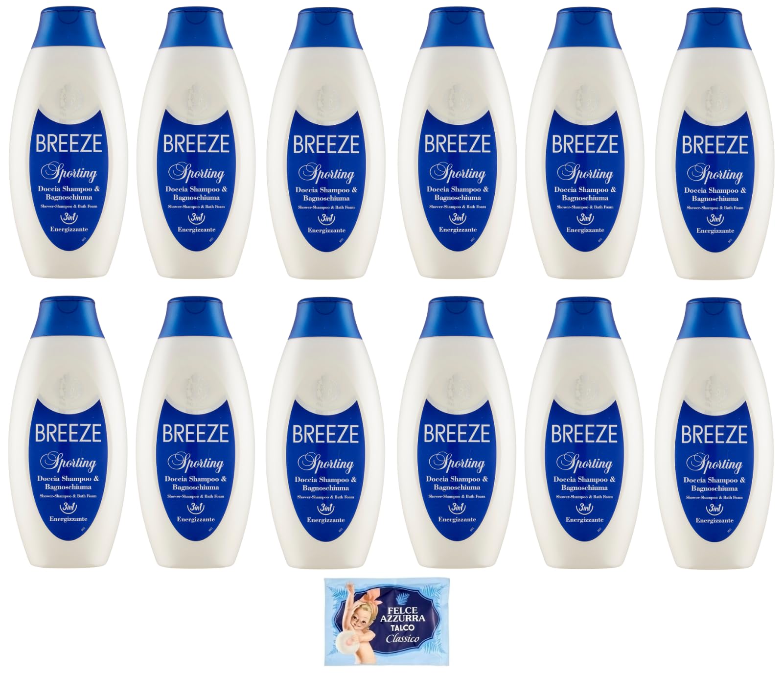 1 free 100g sachet of Felce Azzurra talc. Breeze Sporting Shower Shampoo and Bath Foam is a 3-in-1 cleansing product specially formulated to effectively cleanse the skin of the body while maintaining its natural balance, as well as the hair, leaving it soft and shiny. Helps maintain the skin's natural moisture. The sparkling citrus fragrance envelops the entire body and provides a pleasant feeling of energy and vitality, ideal even after sports activities. - Physiological pH. - Dermatologically tested. Fragrance: Top notes: bergamot, lemon, mandarin, petitgrain. Heart notes: geranium, iris, jasmine, lavender. Base notes: cedarwood, tree musk, patchouli, vetiver. INSTRUCTIONS FOR USE Pour the liquid into the bathtub, ensure the water is at the desired temperature, then step into the bath for a cleansing experience. SAFETY WARNING May cause skin irritation. Do not swallow. Keep out of reach of children. See more12 x BREEZE Sporting Shower et Gel Douche, Nettoie efficacement le corps et les cheveux 400 ml 1 sac à talc Fougère Azzurra 100 gDESCRIPTION DU PRODUIT DESCRIPTION DU PRODUIT 1 sachet de talc Felce Azzurra offert de 100 g Breeze Sporting Douche Shampooing et Bain Mousse est un produit nettoyant 3 en 1 spécialement étudié pour nettoyer efficacement la peau du corps, tout en conservant l'équilibre naturel, ainsi que les cheveux, en lui donnant douceur et brillance. Aide à maintenir l'hydratation naturelle de la peau. Le parfum d'agrumes pétillant enveloppe tout le corps et transmet une agréable sensation d'énergie et de vitalité, idéal même après une activité sportive. - pH physiologique. - Testé sous contrôle dermatologique. Parfum : notes de tête : bergamote, citron, mandarine, petit grain. Notes de cœur : géranium, iris, jasmin, lavande. Notes de fond : bois de cèdre, musc d'arbre, patchouli, vétitre MODE D'EMPLOI Versez le liquide dans la baignoire, assurez-vous que l'eau est à la température désirée, puis entrez dans la baignoire pour une expérience de nettoyage. AVERTISSEMENT DE SÉCURITÉ Peut provoquer une irritation de la peau. Ne pas avaler. Tenir hors de portée des enfants. Voir plus