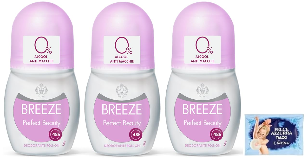 1 free pack of Felce Azzurra talcum powder, 100g pack of Breeze Roll-On Perfect Beauty deodorant. This product effectively regulates perspiration for 48 hours, gently protecting the skin. Its Invisible Care formula helps reduce staining on fabrics. It is also suitable for delicate skin and after hair removal. Alcohol-free. Dermatologically tested. Fragrance: – Top notes: bergamot, lemon, fruity aldehydic notes, lily of the valley – Heart notes: rose, iris, sandalwood, orange blossom. Base notes: amber, heliotrope, plum, talc notes. Directions for use: Apply and allow the product to dry completely before dressing. SAFETY WARNING Keep out of reach of childrenDirections for use: Apply and allow the product to dry completely before dressing. Fragrance: – Top notes: bergamot, lemon, fruity aldehydic notes, lily of the valley – Heart notes: rose, iris, sandalwood, orange blossom. Base notes: amber, heliotrope, plum, talc notes. Dermatologically tested. Its Invisible Care formula helps reduce the formation of stains on fabrics. It is also suitable for delicate skin and after hair removal. Alcohol-free. Breeze Perfect Beauty Roll-On Deodorant helps effectively regulate perspiration for 48 hours, while gently protecting the skin. 1 pack of light blue fern talc, 100g sachet.BREEZE Perfect Beauty Lot de 3 désodorisants Roll On 50 ml 1 paquet de talc Fougère bleue gratuit, enveloppe de 100 gDESCRIPTION DU PRODUIT DESCRIPTION DU PRODUIT 1 paquet de talc Felce Azzurra offert, enveloppe de 100 g Breeze déodorant Roll On Perfect Beauty aide à réguler efficacement la transpiration pendant 48 h, protégeant délicatement la peau. Sa formule Invisible Care aide à réduire la formation de taches sur les tissus. Il est également indiqué pour les peaux délicates et après l'épilation. Sans alcool. Testé sous contrôle dermatologique. Parfum : – Notes de tête : bergamote, citron, notes fruitées aldéhydées, muguet – Notes de cœur : rose, iris, bois de santal, fleurs d'orange. Notes de fond : ambre, héliotrope, prune, notes talquées. Conseils d'utilisation : appliquer et laisser sécher complètement le produit avant de porter les vêtements. AVERTISSEMENT DE SÉCURITÉ Tenir hors de portée des enfantsConseils d'utilisation : appliquer et laisser sécher complètement le produit avant de porter les vêtements. Parfum : – Notes de tête : bergamote, citron, notes fruitées aldéhydées, muguet – Notes de cœur : rose, iris, bois de santal, fleurs d'orange. Notes de fond : ambre, héliotrope, prune, notes talquées. Testé sous contrôle dermatologique. Sa formule Invisible Care aide à réduire la formation de taches sur les tissus. Il est également indiqué pour les peaux délicates et après l'épilation. Sans alcool. Breeze Déodorant Roll On Perfect Beauty aide à réguler efficacement la transpiration pendant 48h, tout en protégeant délicatement la peau. 1 paquet de talc fougère bleu clair, sachet de 100 g.