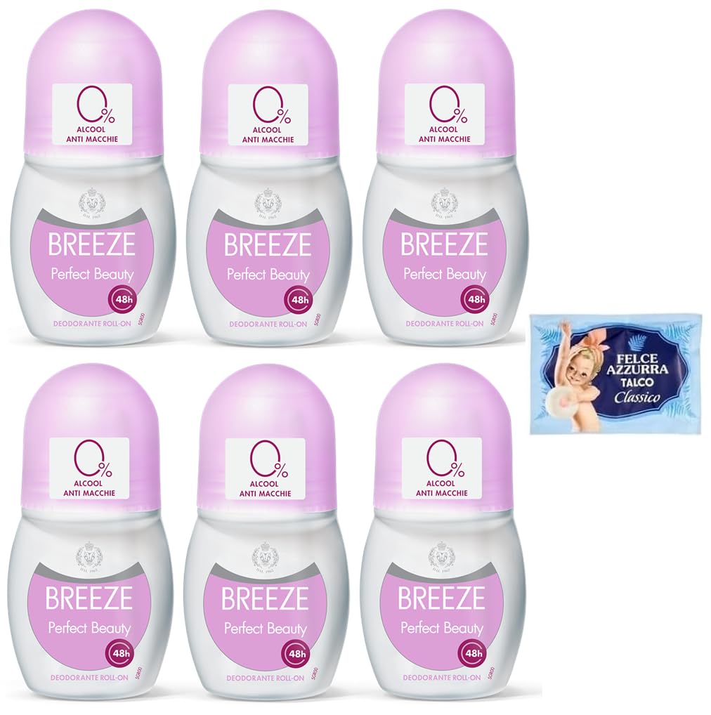 1 free pack of Felce Azzurra talcum powder, 100g pack of Breeze Roll-On Perfect Beauty deodorant. This product effectively regulates perspiration for 48 hours, gently protecting the skin. Its Invisible Care formula helps reduce staining on fabrics. It is also suitable for delicate skin and after hair removal. Alcohol-free. Dermatologically tested. Fragrance: – Top notes: bergamot, lemon, fruity aldehydic notes, lily of the valley – Heart notes: rose, iris, sandalwood, orange blossom. Base notes: amber, heliotrope, plum, talc notes. Directions for use: Apply and allow the product to dry completely before dressing. SAFETY WARNING Keep out of reach of childrenDirections for use: Apply and allow the product to dry completely before dressing. Fragrance: – Top notes: bergamot, lemon, fruity aldehydic notes, lily of the valley – Heart notes: rose, iris, sandalwood, orange blossom. Base notes: amber, heliotrope, plum, talc notes. Dermatologically tested. Its Invisible Care formula helps reduce the formation of stains on fabrics. It is also suitable for delicate skin and after hair removal. Alcohol-free. Breeze Perfect Beauty Roll-On Deodorant helps effectively regulate perspiration for 48 hours, while gently protecting the skin. 1 pack of light blue fern talc, 100g sachet.BREEZE Perfect Beauty Lot de 6 désodorisants Roll On 50 ml 1 paquet de talc Fougère bleue gratuit, enveloppe de 100 gDESCRIPTION DU PRODUIT DESCRIPTION DU PRODUIT 1 paquet de talc Felce Azzurra offert, enveloppe de 100 g Breeze déodorant Roll On Perfect Beauty aide à réguler efficacement la transpiration pendant 48 h, protégeant délicatement la peau. Sa formule Invisible Care aide à réduire la formation de taches sur les tissus. Il est également indiqué pour les peaux délicates et après l'épilation. Sans alcool. Testé sous contrôle dermatologique. Parfum : – Notes de tête : bergamote, citron, notes fruitées aldéhydées, muguet – Notes de cœur : rose, iris, bois de santal, fleurs d'orange. Notes de fond : ambre, héliotrope, prune, notes talquées. Conseils d'utilisation : appliquer et laisser sécher complètement le produit avant de porter les vêtements. AVERTISSEMENT DE SÉCURITÉ Tenir hors de portée des enfantsConseils d'utilisation : appliquer et laisser sécher complètement le produit avant de porter les vêtements. Parfum : – Notes de tête : bergamote, citron, notes fruitées aldéhydées, muguet – Notes de cœur : rose, iris, bois de santal, fleurs d'orange. Notes de fond : ambre, héliotrope, prune, notes talquées. Testé sous contrôle dermatologique. Sa formule Invisible Care aide à réduire la formation de taches sur les tissus. Il est également indiqué pour les peaux délicates et après l'épilation. Sans alcool. Breeze Déodorant Roll On Perfect Beauty aide à réguler efficacement la transpiration pendant 48h, tout en protégeant délicatement la peau. 1 paquet de talc fougère bleu clair, sachet de 100 g.