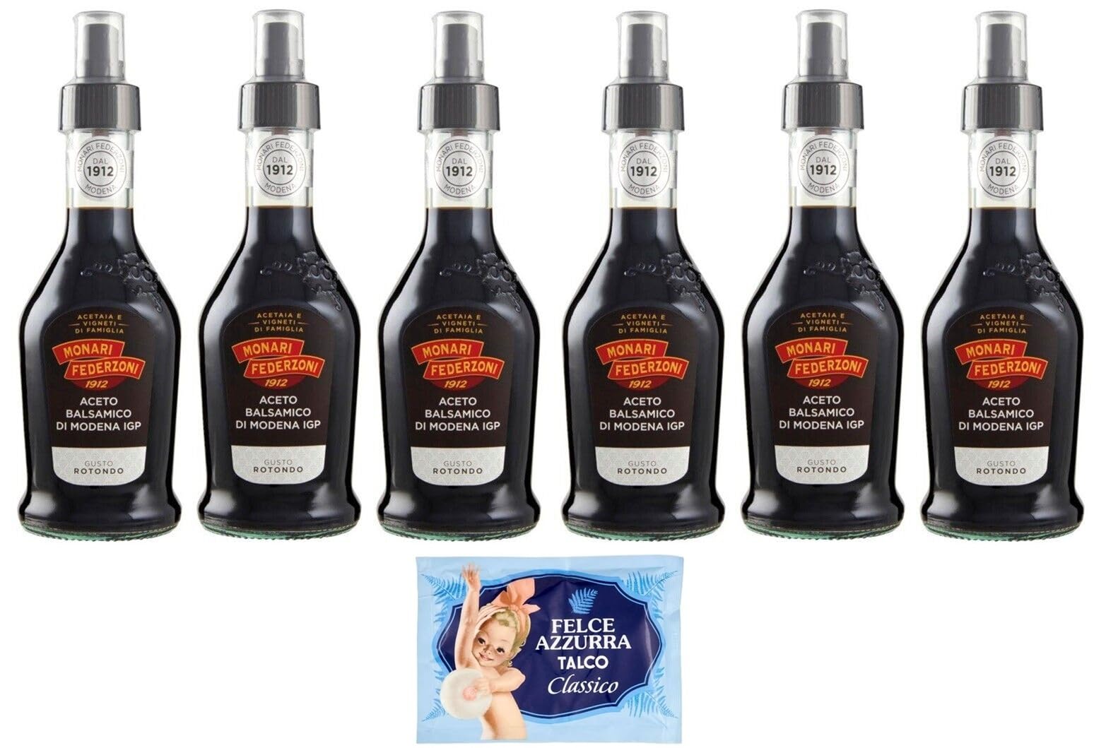Monari Federzoni Aceto Balsamico di Modena I.G.P.Gusto Rotondo, Spray vinaigre balsamique de Modène I.G.P. Bouteille en verre de 250 ml 1 sachet de talc Felce Azzurra gratuit, sachet de 100 g