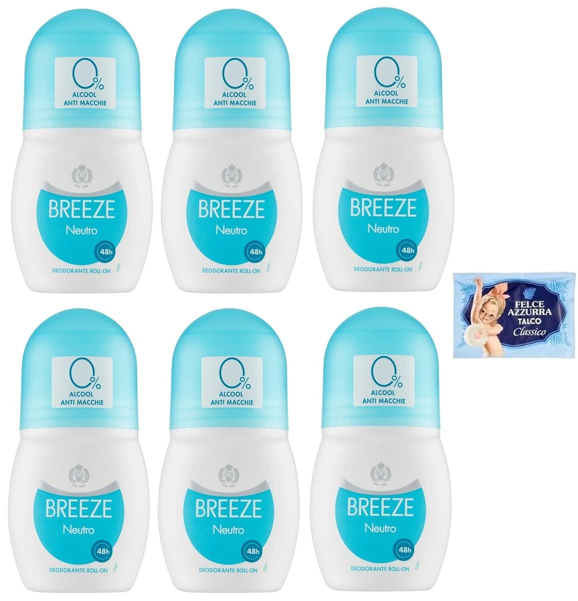 Lot de 6 désodorisants neutres Breeze Roll On 50 ml 1 paquet de talc Fougère bleue gratuit, enveloppe de 100 g