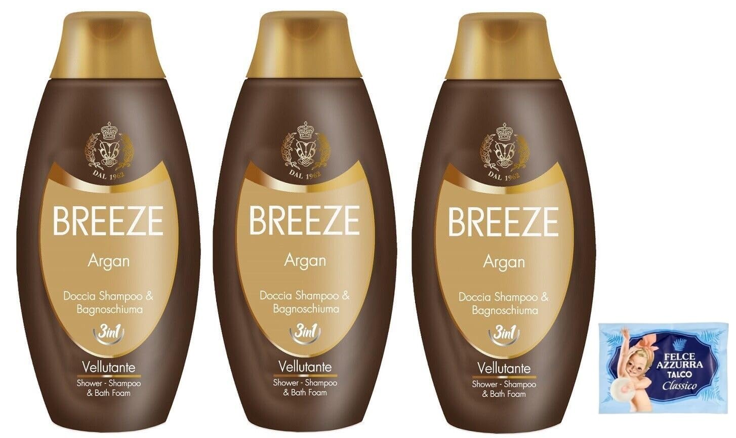 Felce Azzurra Set of 3 shampoos and shower gels argan fragrance effectively cleanses body and hair 400 ml + 1 free 100 g sachet of Blue Fern talcum powder