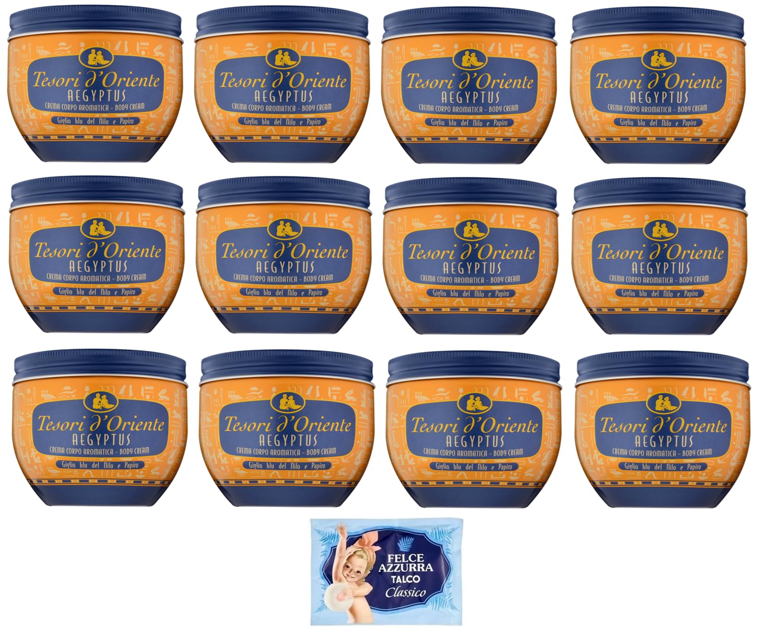 Tesori d'Oriente Crema Corpo Aegyptus, Lot de 12 crèmes pour le corps, au lys bleu du Nil et au lait de papyrus, 300 ml 1 sachet de talc Felce Azzurra gratuit, sachet de 100 g