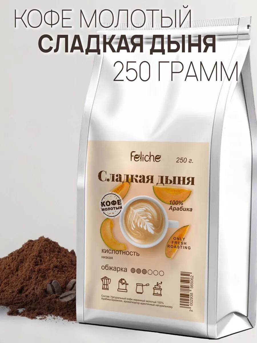 Your morning will be more enjoyable if you start it with aromatic Sweet Melon coffee. We use high-quality Brazilian Mogiana and Brazilian Santos Arabica beans for our flavored coffee, adding natural-identical flavors that are completely safe for the human body. This drink invigorates and lifts your mood. Sweet Melon ground coffee has a bright, recognizable aroma with a classic chocolate-nut flavor. This packaging option is suitable for home use, for preparing in the office, and as a gift. Created for lovers of delicate and smooth drinks, it is ideal for breakfast and lunch. The drink has a light, subtle acidity. The roast is medium. The coffee is ground medium, slightly closer to fine, making it ideal for a coffee machine and for brewing in a cup, as well as for Turkish coffee pots, French presses, and coffee makers. Coffee Feliche is perfect for making lattes, cappuccinos, espressos, and Americanos! It can be enjoyed without sugar, making it ideal for those following a healthy diet. To preserve the flavor and aroma of freshly roasted beans, we use zip-lock packaging (reusable for easy storage and use). To open, pull the special key located on the back, above the degassing valve, ensuring the beans were packaged immediately after roasting, preserving maximum aroma and essential oils. You can always create a gift set from the products available in our store. Give our coffee—it's a delicious gift! The Feliche team wishes you a wonderful mood and pleasant shopping!