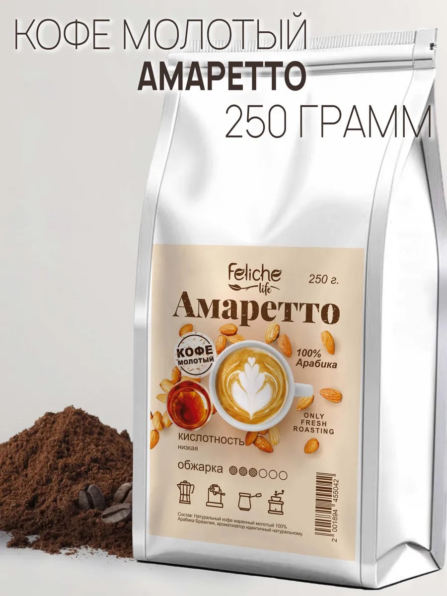 Your morning will be more pleasant if you start it with aromatic Amaretto-flavored coffee. We use high-quality Brazilian Mogiana and Brazilian Santos Arabica beans for our flavored coffee, adding natural-identical flavors that are completely safe for the human body. This drink invigorates and lifts your mood. Ground Amaretto coffee has a soft and refined taste. 100% Arabica, enhanced with the flavor and aroma of sweet almonds, accurately conveys the taste of the Italian Amaretto liqueur, leaving behind a melting, creamy aftertaste. This packaging option is suitable for home use, for preparing in the office, and as a gift. Created for lovers of delicate and smooth drinks, it is ideal for breakfast and lunch. The drink has a light, subtle acidity. The roast level is medium. The coffee is ground medium, slightly fine, making it ideal for coffee machines and cup brewing, as well as for Turkish coffee pots, French presses, and coffee makers. Coffee Feliche is ideal for making lattes, cappuccinos, espressos, and Americanos! It can be enjoyed without sugar, making it ideal for those following a healthy diet. To preserve the flavor and aroma of freshly roasted beans, we use Zip-Lock packaging (reusable for easy storage and use). It opens by pulling a special key located on the back, above the degassing valve, ensuring the beans were packaged immediately after roasting, preserving maximum aroma and essential oils. You can always create a gift set from the products available in our store. Give our coffee—it's a delicious gift! The Feliche team wishes you a wonderful mood and pleasant shopping!