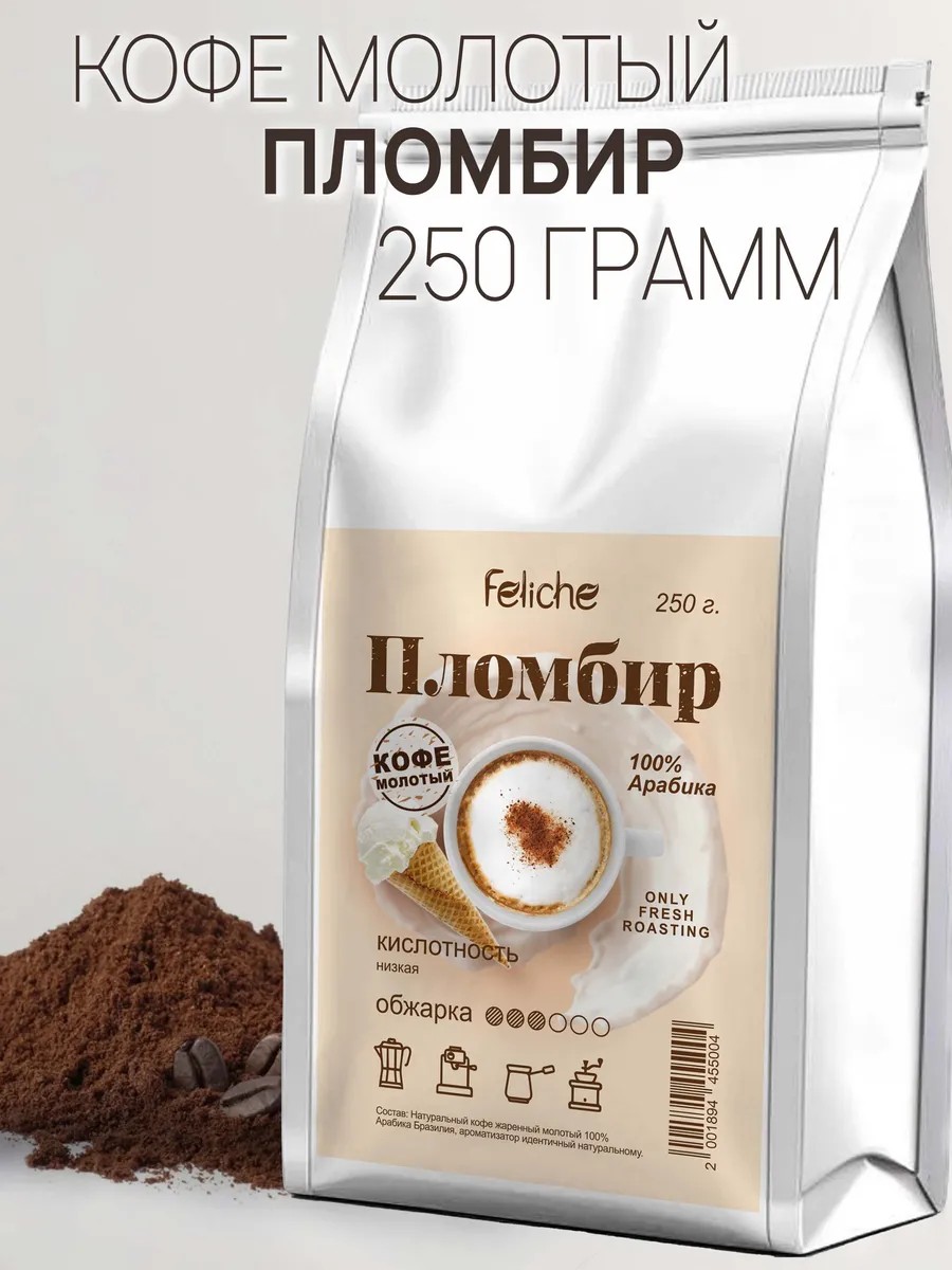 Your morning will be more enjoyable if you start it with aromatic Plombir-flavored coffee. We use high-quality Brazil Mogiana and Brazil Santos Arabica beans for our flavored coffee, adding natural-identical flavors that are completely safe for the human body. This drink invigorates and lifts your mood. Ground Plombir coffee has the memorable taste of that same ice cream from childhood, a pleasant bitterness, and the aroma of creamy Plombir. This packaging option is suitable for home use, for preparing in the office, and as a gift. Created for lovers of delicate and smooth drinks, it is ideal for breakfast and lunch. The drink has a light, subtle acidity. The roast is medium. The coffee is ground medium, slightly closer to fine, making it ideal for a coffee machine and for brewing in a cup, as well as for Turkish coffee pots, French presses, and coffee makers. Coffee Feliche is perfect for making lattes, cappuccinos, espressos, and Americanos! It can be enjoyed without sugar, making it ideal for those following a healthy diet. To preserve the flavor and aroma of freshly roasted beans, we use zip-lock packaging (reusable for easy storage and use). To open, pull the special key located on the back, above the degassing valve, ensuring the beans were packaged immediately after roasting, preserving maximum aroma and essential oils. You can always create a gift set from the products available in our store. Give our coffee—it's a delicious gift! The Feliche team wishes you a wonderful mood and pleasant shopping!