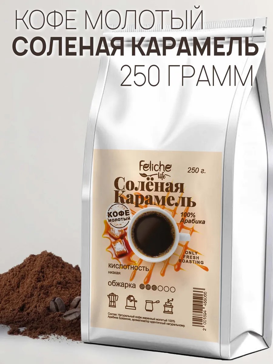 Start your morning with aromatic Salted Caramel coffee. We use high-quality Brazilian Mogiana and Brazilian Santos Arabica beans for our flavored coffee, adding natural-identical flavors that are completely safe for the human body. This drink invigorates and lifts your mood. Ground Salted Caramel coffee has a pleasant, creamy taste with a piquant combination of sweetness and saltiness. This packaging option is suitable for home use, for preparing in the office, and as a gift. Created for lovers of delicate and smooth drinks, it is ideal for breakfast and lunch. The drink has a light, subtle acidity. The roast is medium. The coffee is ground medium, slightly closer to fine, making it ideal for a coffee machine and for brewing in a cup, as well as for Turkish coffee, French press, and coffee makers. Coffee Feliche is ideal for making lattes, cappuccinos, espressos, and Americanos! The drink can be enjoyed without sugar, making it ideal for those following a healthy diet. To preserve the flavor and aroma of freshly roasted beans, we use zip-lock packaging (reusable for easy storage and use). It opens by pulling a special key located on the back, above the degassing valve, ensuring the beans are packaged immediately after roasting, preserving maximum aroma and essential oils. You can always create a gift set from the products available in our store. Give our coffee—it's a delicious gift! The Felice team wishes you a wonderful mood and happy shopping!