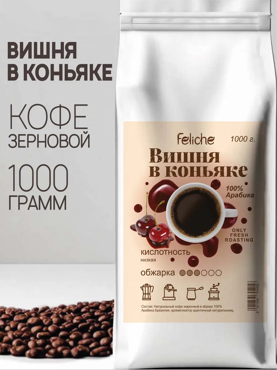 Your morning will be more pleasant if you start it with aromatic coffee with the Cherry in Cognac flavor. We use high-quality Arabica beans from Brazil Mogiana and Brazil Santos for our flavored coffee, adding natural-identical flavors that are completely safe for the human body. This drink invigorates and lifts your mood. Cherry in Cognac whole-bean coffee has an aroma of cognac and berry notes. It has a sweet, lingering aftertaste. This packaging option is suitable for home use, for preparing in the office, and as a gift. Created for lovers of delicate and smooth drinks, it is ideal for breakfast and lunch. The drink has a light, subtle acidity. The roast is medium. Whole-bean coffee is suitable for a coffee machine, and after grinding, it can be used in a Turkish coffee pot, a French press, a coffee maker, or simply brewed in a cup. Coffee Feliche is perfect for making lattes, cappuccinos, espressos, and Americanos! It can be enjoyed without sugar, making it ideal for those following a healthy diet. To preserve the flavor and aroma of freshly roasted beans, we use zip-lock packaging (reusable for easy storage and use). Open the zip-lock by pulling the special key located on the back, above the degassing valve, ensuring the beans are packaged immediately after roasting, preserving maximum aroma and essential oils. You can always create a gift set from the products available in our store. Give our coffee—it's a delicious gift! The Feliche team wishes you a wonderful mood and happy shopping!