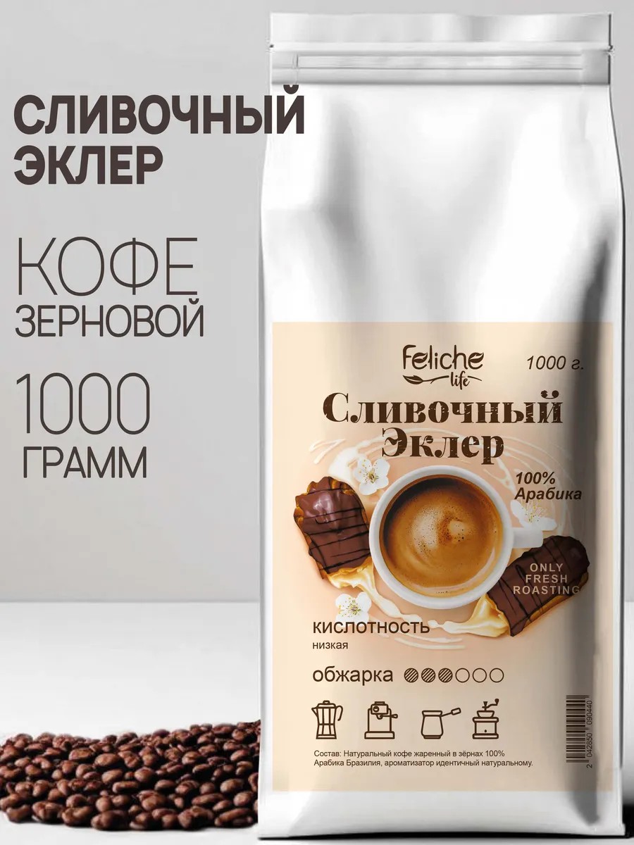 Утро будет приятнее, если Вы начнете его с ароматного кофе со вкусом Сливочный эклер. В качестве основы для нашего ароматизированного кофе мы используем качественную арабику Бразилия Моджиана и Бразилия Сантос с добавлением идентичных натуральным ароматизаторов, абсолютно безопасных для организма человека. Напиток бодрит и повышает настроение. Кофе в зернах Сливочный эклер обладает мягким и изысканным вкусом. Десертный кофе изготовлен на основе 100% арабики, в одной порции смешивается сразу несколько оттенков - сладость и соленость. Такой вариант фасовки подойдет для домашнего использования, для приготовления в офисе и в качестве подарка. Создан для любителей нежных и мягких напитков. Идеален для завтрака и обеденного перерыва. Кислотность напитка легкая, слабовыраженная. Степень обжарки - средняя. Зерновой кофе подходит для кофемашины, а после помола и для для турки, френч-пресса и кофеварке или просто заваривания в чашке. Coffee Feliche идеально подходит для приготовления латте, капучино, эспрессо и американо! Напиток можно пить без сахара, поэтому отлично подходит для покупателей, которые соблюдают правильное питание и диету. Для того чтобы максимально сохранить вкус и аромат свежеобжаренных зёрен, мы применяем в производстве упаковку с Zip-Lock замком (многократное открытие и закрытие для удобства хранения и использования). Его нужно открыть, потянув за специальный ключик-замок, он находится на обратной стороне, над клапаном дегазации, который гарантирует, что зерна были упакованы сразу после обжарки, соответственно, сохранили максимум аромата и эфирных масел. Вы всегда можете собрать подарочный набор из товаров, доступных в нашем магазине. Дарите наш кофе- это очень вкусный подарок! Команда Феличе желает вам прекрасного настроения и приятных покупок!