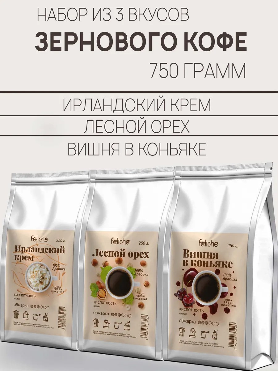 Утро будет приятнее, если Вы начнете его с ароматным набором из 3 пачек зернового кофе по 250гр: Ирландские Сливки, Лесной Орех, Вишня в Коньяке. В качестве основы для нашего ароматизированного кофе мы используем качественную арабику Бразилия Моджиана и Бразилия Сантос с добавлением идентичных натуральным ароматизаторов, абсолютно безопасных для организма человека. Напиток бодрит и повышает настроение. Кофе в зернах Irish Cream сочетают виски и сливочный вкус. Лесной орех превосходный напиток с пленительным, терпким ароматом гармонично сочетается с восхитительным, чуть сладковатым и нежным ароматом спелых лесных орехов. Вишня в коньяке обладает бархатистой текстурой с ягодными нотами. Во вкусе вишня, шоколад и винные оттенки. Такой вариант фасовки подойдет для домашнего использования, для приготовления в офисе и в качестве подарка. Создан для любителей нежных и мягких напитков. Идеален для завтрака и обеденного перерыва. Кислотность напитка легкая, слабовыраженная. Степень обжарки - средняя. Зерновой кофе подходит для кофемашины, а после помола и для для турки, френч-пресса и кофеварке или просто заваривания в чашке. Coffee Feliche идеально подходит для приготовления латте, капучино, эспрессо и американо! Напиток можно пить без сахара, поэтому отлично подходит для покупателей, которые соблюдают правильное питание и диету. Для того чтобы максимально сохранить вкус и аромат свежеобжаренных зёрен, мы применяем в производстве упаковку с Zip-Lock замком (многократное открытие и закрытие для удобства хранения и использования). Его нужно открыть, потянув за специальный ключик-замок, он находится на обратной стороне, над клапаном дегазации, который гарантирует, что зерна были упакованы сразу после обжарки, соответственно, сохранили максимум аромата и эфирных масел. Вы всегда можете собрать подарочный набор из товаров, доступных в нашем магазине. Дарите наш кофе- это очень вкусный подарок! Команда Феличе желает вам прекрасного настроения и приятных покупок!