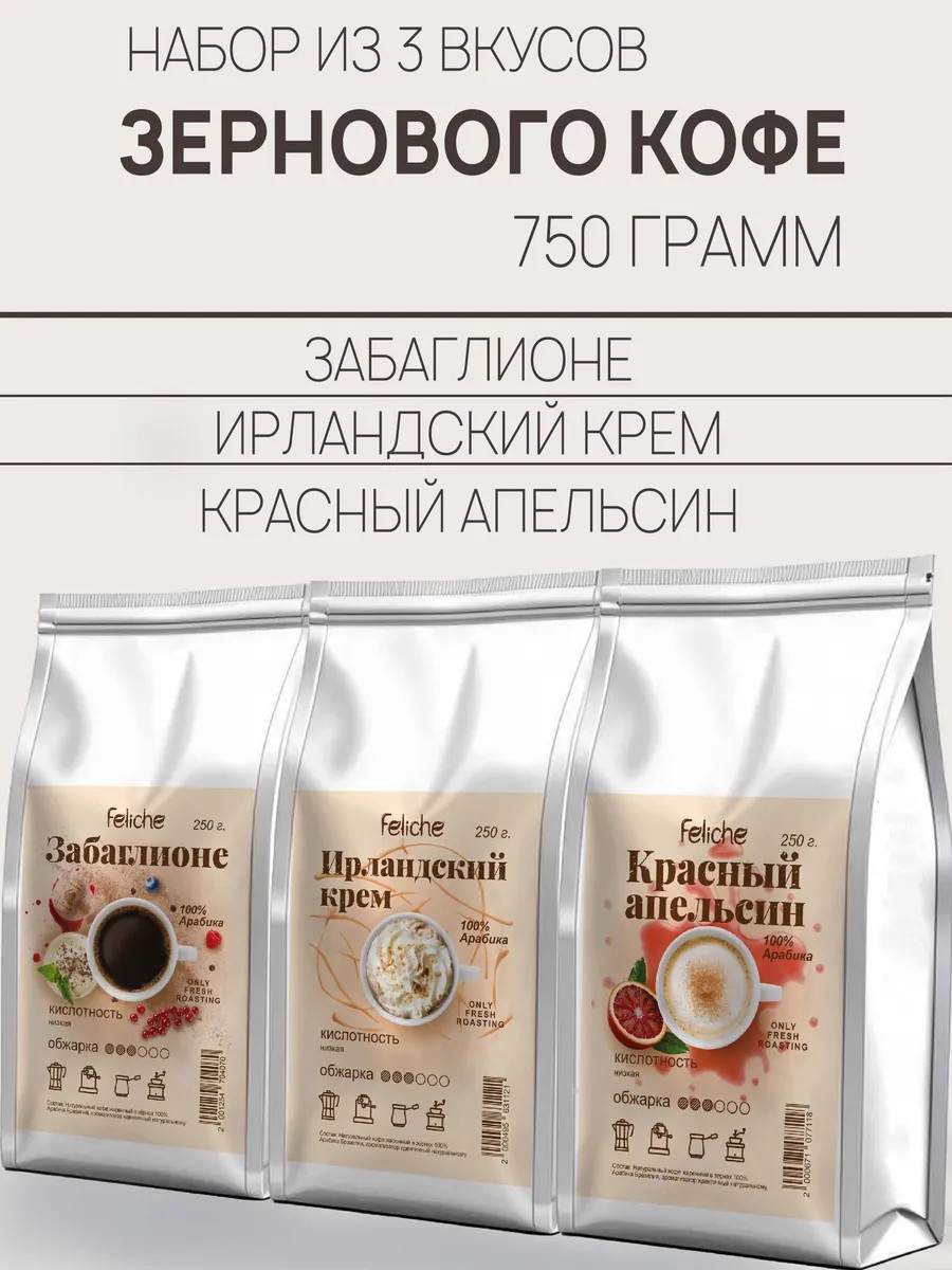 Утро будет приятнее, если Вы начнете его с ароматного набора зернового кофе 3 пачки по 250гр: Забаглионе, Ирландские Сливки, Красный Апельсин. В качестве основы для нашего ароматизированного кофе мы используем качественную арабику Бразилия Моджиана и Бразилия Сантос с добавлением идентичных натуральным ароматизаторов, абсолютно безопасных для организма человека. Напиток бодрит и повышает настроение. Кофе в зернах Забаглионе обладает характерной винной кислинкой и сладостью молочного шоколада. Irish Cream сочетают ирландский виски и сливки. Красный Апельсин придает напитку яркий и насыщенный вкус. Такой вариант фасовки подойдет для домашнего использования, для приготовления в офисе и в качестве подарка. Создан для любителей нежных и мягких напитков. Идеален для завтрака и обеденного перерыва. Кислотность напитка легкая, слабовыраженная. Степень обжарки - средняя. Зерновой кофе подходит для кофемашины, а после помола и для для турки, френч-пресса и кофеварке или просто заваривания в чашке. Coffee Feliche идеально подходит для приготовления латте, капучино, эспрессо и американо! Напиток можно пить без сахара, поэтому отлично подходит для покупателей, которые соблюдают правильное питание и диету. Для того чтобы максимально сохранить вкус и аромат свежеобжаренных зёрен, мы применяем в производстве упаковку с Zip-Lock замком (многократное открытие и закрытие для удобства хранения и использования). Его нужно открыть, потянув за специальный ключик-замок, он находится на обратной стороне, над клапаном дегазации, который гарантирует, что зерна были упакованы сразу после обжарки, соответственно, сохранили максимум аромата и эфирных масел. Вы всегда можете собрать подарочный набор из товаров, доступных в нашем магазине. Дарите наш кофе- это очень вкусный подарок! Команда Феличе желает вам прекрасного настроения и приятных покупок!