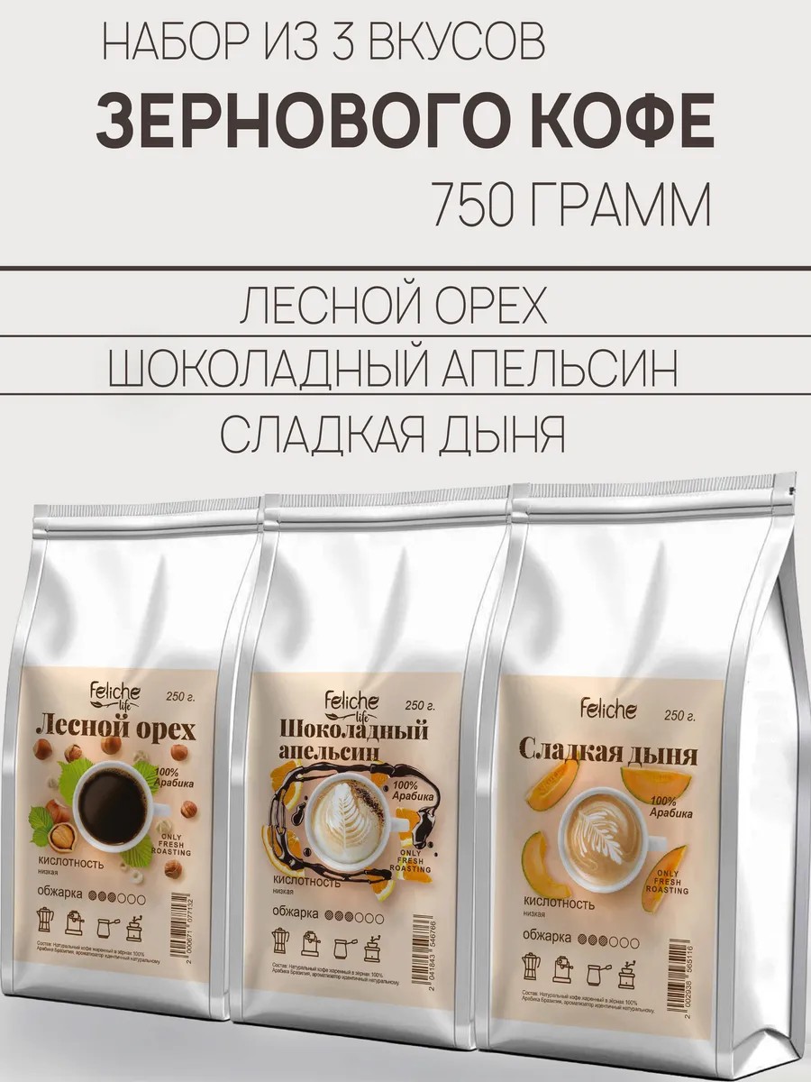 Утро будет приятнее, если Вы начнете его с ароматного набора зернового кофе из 3 пачек по 250гр: Лесной орех, Шоколадный апельсин, Сладкая дыня. В качестве основы для нашего ароматизированного кофе мы используем качественную арабику Бразилия Моджиана и Бразилия Сантос с добавлением идентичных натуральным ароматизаторов, абсолютно безопасных для организма человека. Напиток бодрит и повышает настроение. Кофе Лесной Орех превосходный десертный напиток. Пленительный терпкий аромат обжаренных зерен гармонично сочетается с восхитительным, чуть сладковатым и очень нежным ароматом спелых лесных орехов. Кофе в зернах Шоколадный Апельсин - десертный напиток с потрясающим сочетанием цитрусового привкуса, шоколадом и кофейной терпкостью. Кофе зерновой Сладкая Дыня - яркий, узнаваемый аромат с классическим шоколадно-ореховым вкусом. Такой вариант фасовки подойдет для домашнего использования, для приготовления в офисе и в качестве подарка. Создан для любителей нежных и мягких напитков. Идеален для завтрака и обеденного перерыва. Кислотность напитка легкая, слабовыраженная. Степень обжарки - средняя. Зерновой кофе подходит для кофемашины, а после помола и для для турки, френч-пресса и кофеварке или просто заваривания в чашке. Coffee Feliche идеально подходит для приготовления латте, капучино, эспрессо и американо! Напиток можно пить без сахара, поэтому отлично подходит для покупателей, которые соблюдают правильное питание и диету. Для того чтобы максимально сохранить вкус и аромат свежеобжаренных зёрен, мы применяем в производстве упаковку с Zip-Lock замком (многократное открытие и закрытие для удобства хранения и использования). Его нужно открыть, потянув за специальный ключик-замок, он находится на обратной стороне, над клапаном дегазации, который гарантирует, что зерна были упакованы сразу после обжарки, соответственно, сохранили максимум аромата и эфирных масел. Вы всегда можете собрать подарочный набор из товаров, доступных в нашем магазине. Дарите наш кофе- это очень вкусный подарок! Команда Феличе желает вам прекрасного настроения и приятных покупок!
