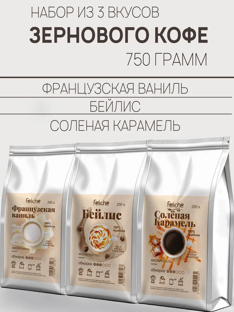 Утро будет приятнее, если Вы начнете его с ароматного набора зернового кофе из 3 пачек по 250гр: Французская Ваниль, Бейлис, Соленая Карамель. В качестве основы для нашего ароматизированного кофе мы используем качественную арабику Бразилия Моджиана и Бразилия Сантос с добавлением идентичных натуральным ароматизаторов, абсолютно безопасных для организма человека. Напиток бодрит и повышает настроение. Французская Ваниль- насыщенный сладкий аромат ванили, нежность сливок, горчинка шоколада и богатый вкус натуральной арабики перенесут вас в уютное французское кафе! Бейлис- это нежное сочетание вкуса 100% арабики высшего сорта, и аромата популярного ликера Бейлис без капли алкоголя в составе. Мягкий сливочный вкус прекрасно сочетается с крепостью арабики.