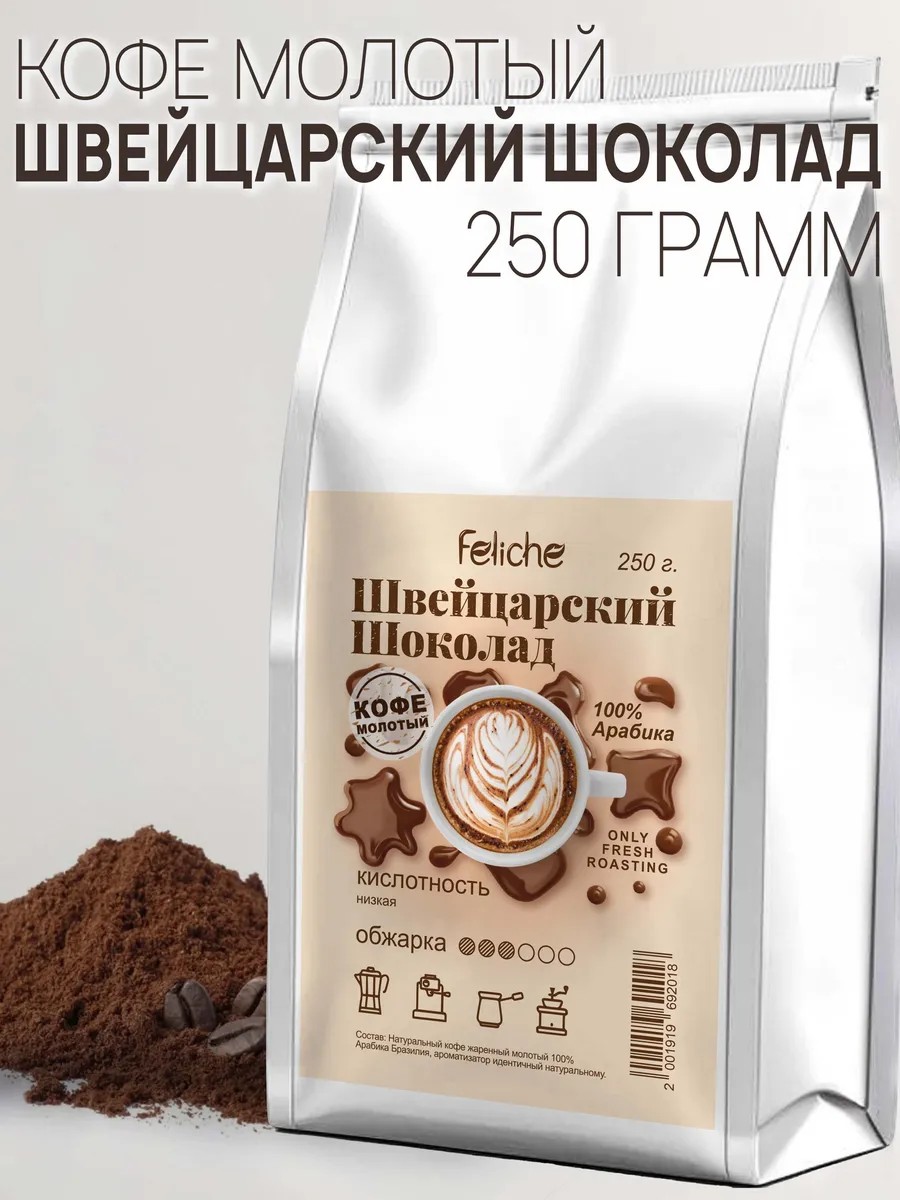 Your morning will be more enjoyable if you start it with aromatic Swiss Chocolate-flavored coffee. We use high-quality Brazilian Mogiana and Brazilian Santos Arabica beans for our flavored coffee, adding natural-identical flavors that are completely safe for the human body. This drink invigorates and lifts your mood. Swiss Chocolate ground coffee is soft and refined, with the piquant, noble taste of Brazilian Arabica, with hints of caramel and the aroma of dark chocolate. This amazing drink is distinguished by a subtle note of rich coffee flavor and a tropical nutty cocktail. This packaging option is suitable for home use, for preparing in the office, and as a gift. Created for lovers of delicate and smooth drinks, it is ideal for breakfast and lunch. The drink has a light, subtle acidity. The roast level is medium. The coffee is ground medium, slightly fine, making it ideal for coffee machines and cup brewing, as well as for Turkish coffee pots, French presses, and coffee makers. Coffee Feliche is ideal for making lattes, cappuccinos, espressos, and Americanos! It can be enjoyed without sugar, making it ideal for those following a healthy diet. To preserve the flavor and aroma of freshly roasted beans, we use Zip-Lock packaging (reusable for easy storage and use). It opens by pulling a special key located on the back, above the degassing valve, ensuring the beans were packaged immediately after roasting, preserving maximum aroma and essential oils. You can always create a gift set from the products available in our store. Give our coffee—it's a delicious gift! The Feliche team wishes you a wonderful mood and pleasant shopping!