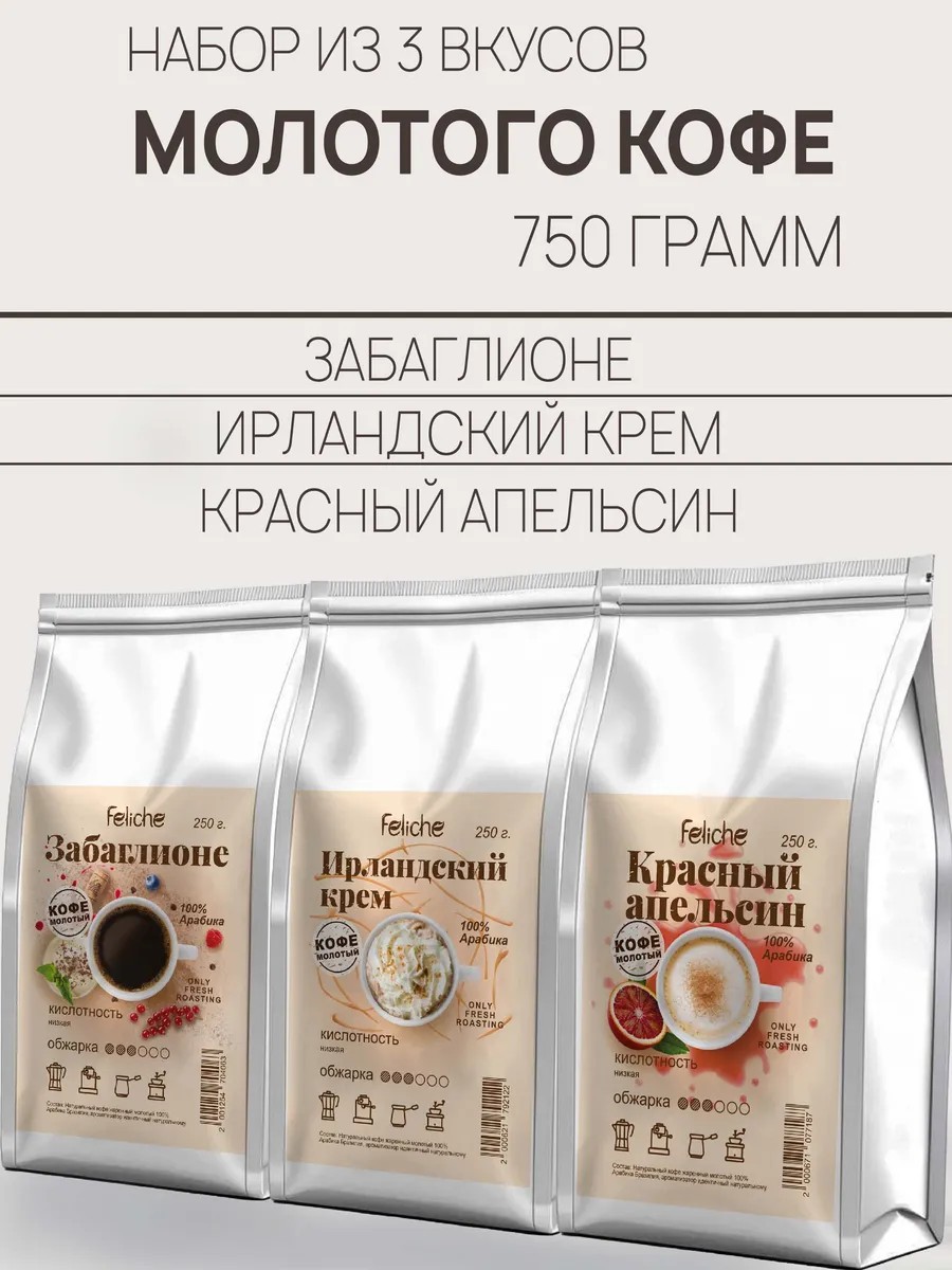 Утро будет приятнее, если Вы начнете его с ароматным набором из 3 пачек молотого кофе по 250 гр: Забаглионе, Ирландские Сливки, Красный Апельсин. В качестве основы для нашего ароматизированного кофе мы используем качественную арабику Бразилия Моджиана и Бразилия Сантос с добавлением идентичных натуральным ароматизаторов, абсолютно безопасных для организма человека. Напиток бодрит и повышает настроение. Молотый кофе Забаглионе богат шоколадными и винными нотами. Irish Cream сочетают в себе ирландский виски и сливки. Красный Апельсин придает напитку яркий и насыщенный вкус цитруса. Такой вариант фасовки подойдет для домашнего использования, для приготовления в офисе и в качестве подарка. Создан для любителей нежных и мягких напитков. Идеален для завтрака и обеденного перерыва. Кислотность напитка легкая, слабовыраженная. Степень обжарки - средняя. Помол кофе средний, чуть ближе к мелкому, поэтому идеально подходит для кофемашины и заваривания в чашке, а так же кофе для турки, френч-пресса, и кофеварки. Coffee Feliche идеально подходит для приготовления латте, капучино, эспрессо и американо! Напиток можно пить без сахара, поэтому отлично подходит для покупателей, которые соблюдают правильное питание и диету. Для того чтобы максимально сохранить вкус и аромат свежеобжаренных зёрен, мы применяем в производстве упаковку с Zip-Lock замком (многократное открытие и закрытие для удобства хранения и использования). Его нужно открыть, потянув за специальный ключик-замок, он находится на обратной стороне, над клапаном дегазации, который гарантирует, что зерна были упакованы сразу после обжарки, соответственно, сохранили максимум аромата и эфирных масел. Вы всегда можете собрать подарочный набор из товаров, доступных в нашем магазине. Дарите наш кофе - это очень вкусный подарок! Команда Феличе желает вам прекрасного настроения и приятных покупок!