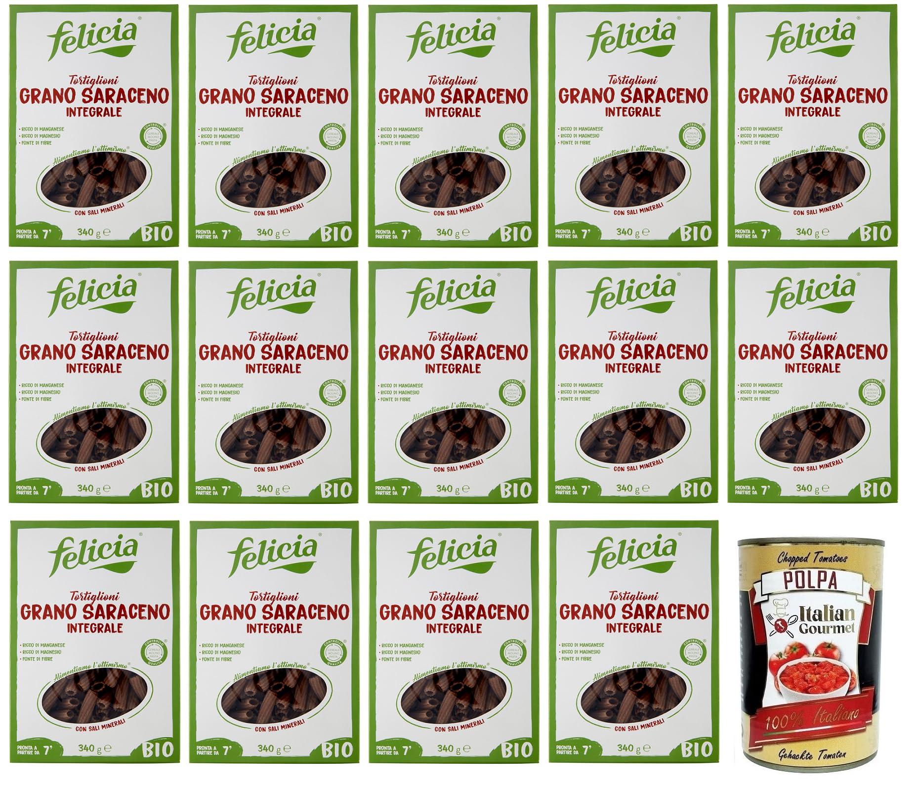 Felicia Tortiglioni di Grano Saraceno Integrale, pasta met 100 biologische boekweit, biologisch en natuurlijk glutenvrij, verpakking van 340 g Italian Gourmet Polpa di Pomodoro 400 g blikje, 14