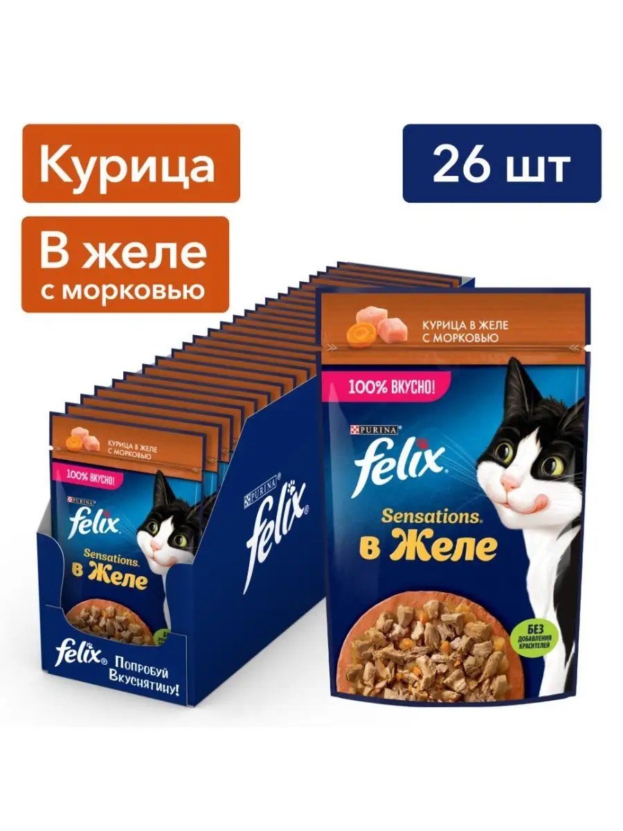 Felix Sensations wet food for adult cats, with chicken and carrots in jelly, in pouches - 75 g x 26 pcs. To provide your pet with the richest palette of taste and aroma, Purina experts created Felix "Sensations" wet food for adult cats. Felix wet cat food, created from high-quality ingredients with carefully prepared tender pieces in delicious jelly, will give your pet an amazing feeling and the optimal combination of nutrients for an active and healthy life. 100% balanced complete diet. Balanced minerals.
