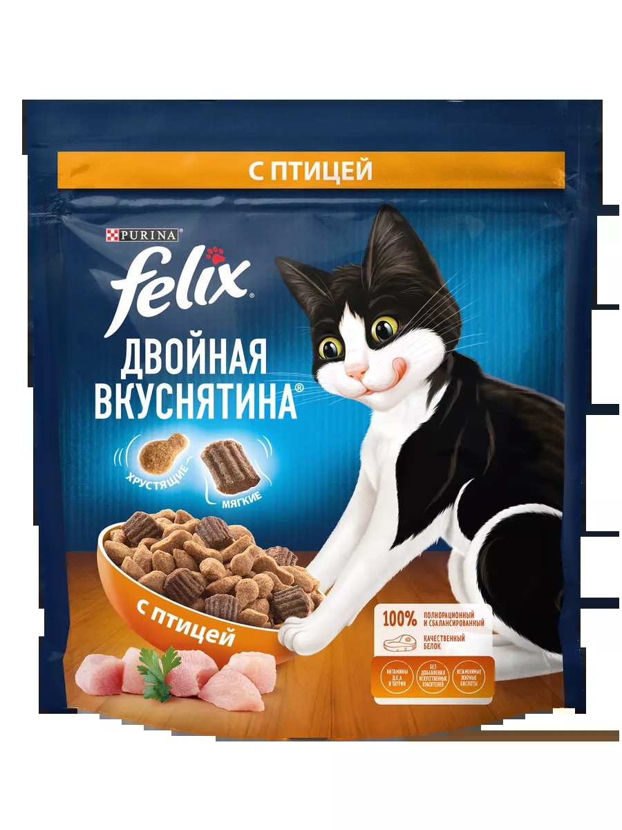 Любопытство Вашего кота заложено природой! И бренд Felix снова придумал, как его удовлетворить. Представляем Felix Двойная Вкуснятина – сухой корм для кошек, который полностью соответствует потребностям Вашего озорника. Восхитительное сочетание двух текстур в одной упаковке: хрустящие гранулы смешаны с мягкими кусочками для создания невероятного вкуса, перед которым невозможно устоять! Широкий ассортимент позволит коту наслаждаться разнообразием мясных или рыбных вкусов с соблазнительными ароматами.Felix Двойная Вкуснятина - первый сухой корм, созданный под брендом Felix для находчивого кота, который знает толк во вкусной еде.• Не содержит искусственных красителей и консервантов• Сочетание хрустящих гранул с мягкими и нежными кусочками• 100% сбалансированный полный рацион• Содержит витамины А, Д, Е и тауринСовет от Felix: Вы пробовали комбинировать сухой и влажный корм в ежедневном рационе Вашего кота? Попробуйте! Ведь теперь Felix доступен в обоих рационах.Рекомендуемая суточная норма зависит от погодных условий, уровня активности кошки и ее физических особенностей. Индивидуальные потребности кошки могут варьироваться, и ежедневное количество корма должно быть скорректировано по мере необходимости для поддержания оптимального веса Вашей кошки. Следите, чтобы у Вашей кошки всегда была свежая чистая питьевая вода. Достаточное ежедневное потребление воды - обязательное условие здоровья Вашего питомцаСостав товара:злаки, мясо и продукты переработки мяса (мин. 4% птицы на базе восстановленного вещества), продукты переработки растительного сырья, масла и жиры, глицерол, экстракты растительного белка, консерванты, минеральные вещества, дрожжи, сахара, аминокислоты, витамины, красители, антиоксиданты.Условия хранения:Хранить в сухом прохладном месте. Упаковка не предназначена для игры. Для предотвращения риска удушения храните в недоступной для детей и животных месте. Годен до, дату изготовления, регистрационный номер фабрики и номер партии: см. на упаковке.