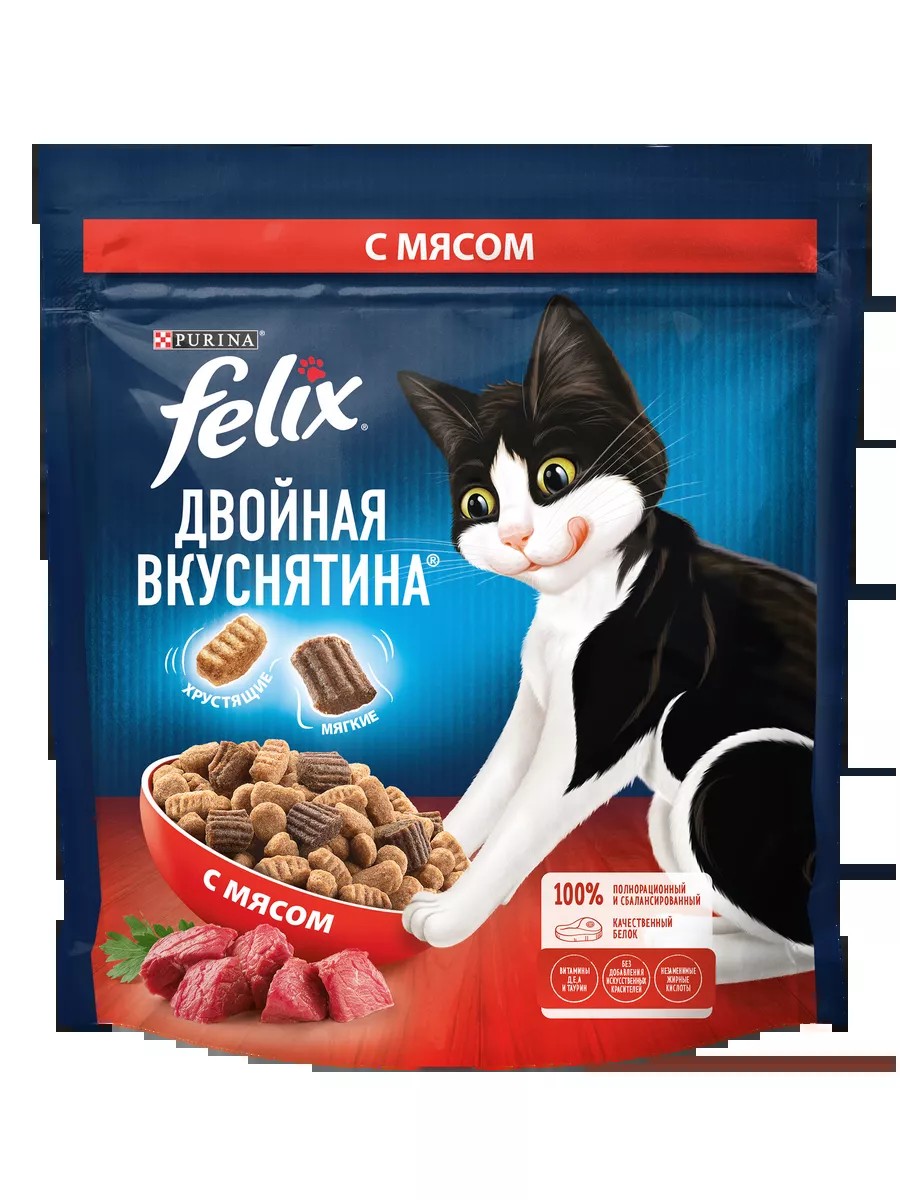 Любопытство Вашего кота заложено природой! И бренд Felix снова придумал, как его удовлетворить. Представляем Felix Двойная Вкуснятина – сухой корм для кошек, который полностью соответствует потребностям Вашего озорника. Восхитительное сочетание двух текстур в одной упаковке: хрустящие гранулы смешаны с мягкими кусочками для создания невероятного вкуса, перед которым невозможно устоять! Широкий ассортимент позволит коту наслаждаться разнообразием мясных или рыбных вкусов с соблазнительными ароматами.Felix Двойная Вкуснятина - первый сухой корм, созданный под брендом Felix для находчивого кота, который знает толк во вкусной еде.• Не содержит искусственных красителей и консервантов• Сочетание хрустящих гранул с мягкими и нежными кусочками• 100% сбалансированный полный рацион• Содержит витамины А, Д, Е и тауринСовет от Felix: Вы пробовали комбинировать сухой и влажный корм в ежедневном рационе Вашего кота? Попробуйте! Ведь теперь Felix доступен в обоих рационах.Рекомендуемая суточная норма зависит от погодных условий, уровня активности кошки и ее физических особенностей. Индивидуальные потребности кошки могут варьироваться, и ежедневное количество корма должно быть скорректировано по мере необходимости для поддержания оптимального веса Вашей кошки. Следите, чтобы у Вашей кошки всегда была свежая чистая питьевая вода. Достаточное ежедневное потребление воды - обязательное условие здоровья Вашего питомцаСостав товара:злаки, мясо и продукты переработки мяса (мин. 4% мяса на базе восстановленного вещества), продукты переработки растительного сырья, масла и жиры, экстракты растительного белка, глицерол, консерванты, минеральные вещества, дрожжи, сахара, аминокислоты, витамины, красители, антиоксидантыУсловия хранения:Хранить в сухом прохладном месте. Упаковка не предназначена для игры. Для предотвращения риска удушения храните в недоступной для детей и животных месте. Годен до, дату изготовления, регистрационный номер фабрики и номер партии: см. на упаковке.