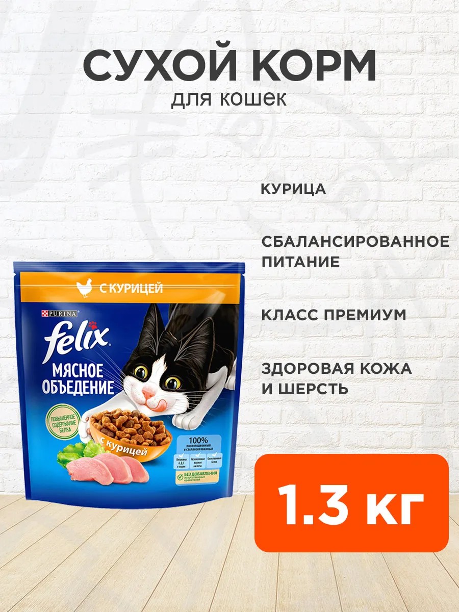 Felix Корм сухой Мясное Объедение для кошек курица 1,3 кг