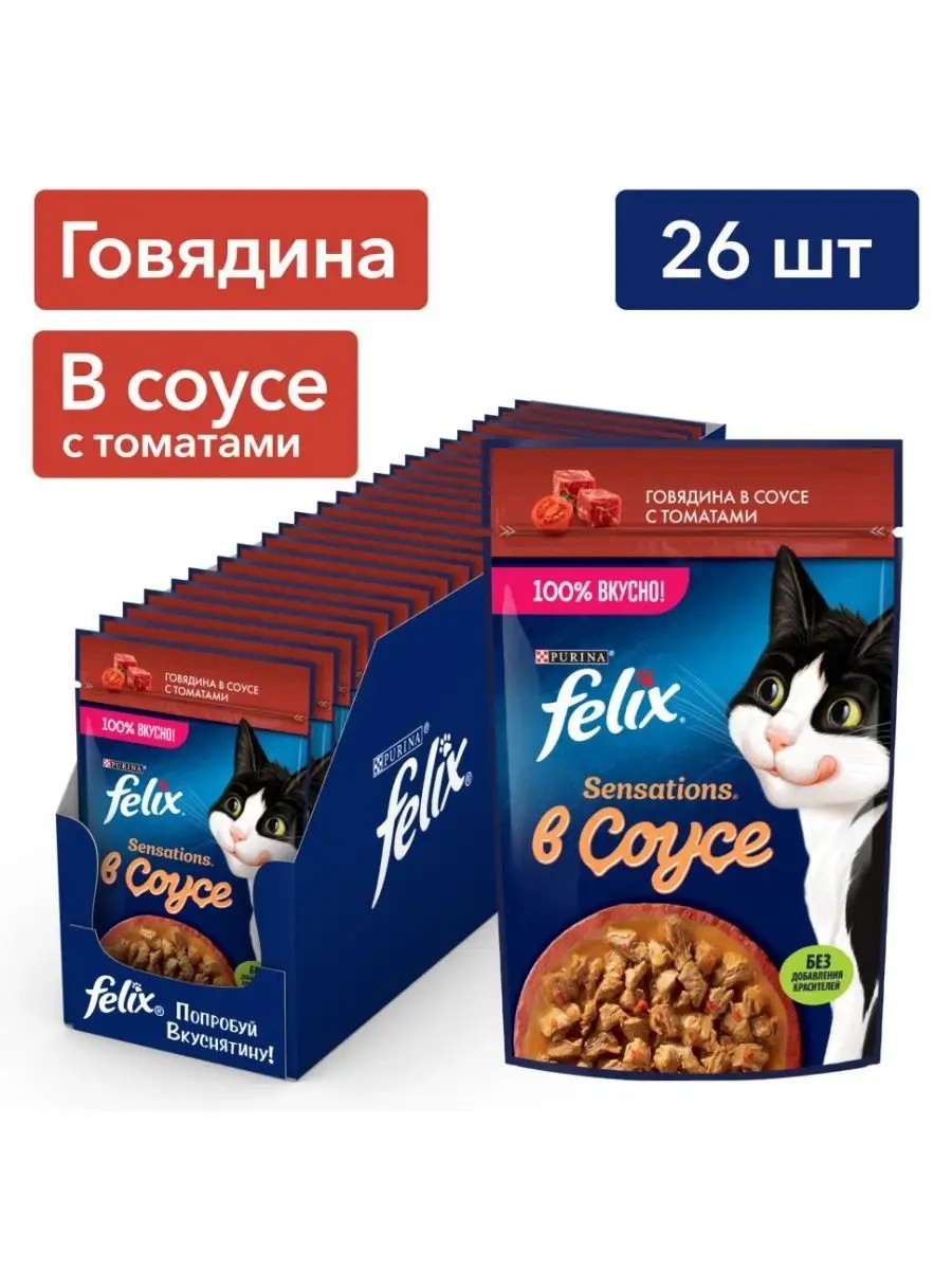 Felix Sensations wet food for adult cats, beef with tomatoes in sauce, in pouches - 75 g x 26 pcs. To provide your pet with the richest palette of taste and aroma, Purina experts created Felix "Sensations" wet food for adult cats. Felix wet cat food, created from high-quality ingredients with carefully prepared tender pieces in a delicious jelly, will give your pet an amazing feeling and the optimal combination of nutrients for an active and healthy life. 100% balanced complete diet. Balanced minerals.