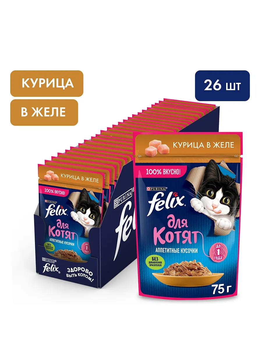 Felix Аппетитные кусочки влажный корм для котят с курицей, в паучах - 75 г х 26 шт. Корм для взрослых кошек не подходит маленьким озорникам: в период активного роста котятам нужно даже больше питательных веществ, чем солидным котам. При этом пищеварительная система малыша еще остается уязвимой, котенку непросто переходить с молока мамы-кошки на самостоятельное питание. Разрабатывая влажные корма для домашних питомцев, эксперты Purina создали совершенно особый корм для кошек - рацион Felix "Аппетитные кусочки" для котят. Нежнейшие кусочки, покрытые сочным желе, помогут Вашему котенку не только получать необходимую энергию и микронутриенты, но и постепенно привыкать к "взрослой" пище, а также с самого детства наслаждаться богатством нежнейших вкусов. 100% всё, что нужно котёнку каждый день. Содержит белки, витамины и минеральные вещества. Специально разработан для котят до 1 года. Ингредиенты: мясо и мясные ингредиенты (включая курицу), экстракты растительного белка, рыба и продукты ее переработки, аминокислоты, продукты переработки растительного сырья, загустители, минеральные вещества, сахара, витамины. Гарантированные показатели: влажность: 77,5%, белок: 13,5%, содержание жира: 2,8%, сырая зола: 2,6%, сырая клетчатка: 0,8%, энергетическая ценность: 91 ккал/100 г.