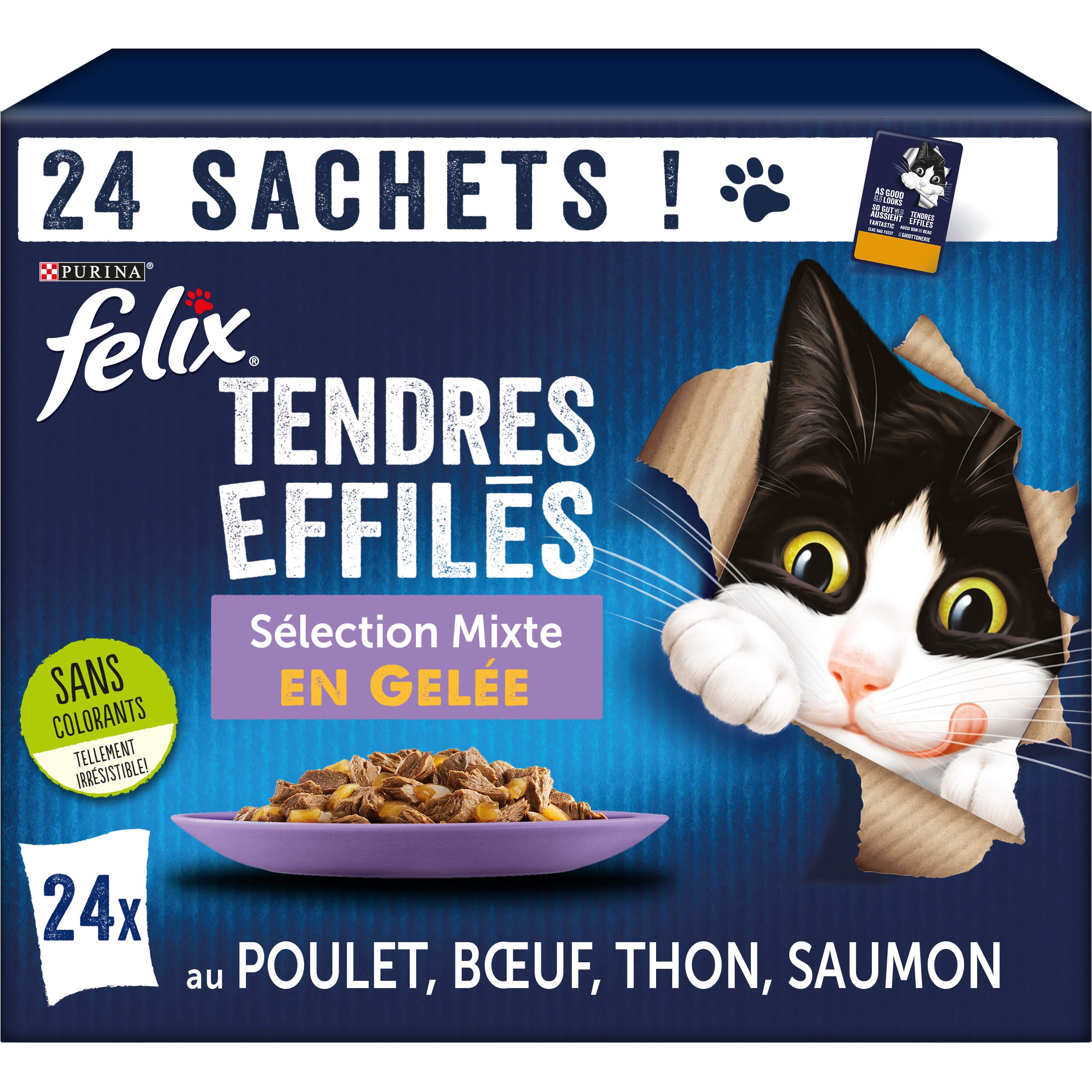 FELIX Tender Shreds are delicious meals that look, smell, and taste so appetizing you could have cooked them yourself. Each recipe is made with quality ingredients and contains tender shreds coated in jelly that will delight your cat at every meal! These meals are a source of Omega-6 fatty acids with the right balance of vitamins to help your cat stay in top condition and ready for even more mischief! They contain all the nutritional benefits to meet 100 of your cat's daily needs, according to the recommended daily rations on the packaging. And that's not all! FELIX Tender Shreds are available in a wide range of delicious recipes in jelly to satisfy your cat's craving for variety. They really are as good as they look! FELIX, so irresistible! INGREDIENTS Beef: Meat and animal derivatives (14 , including 4 beef), Vegetable protein extracts, Fish and fish derivatives, Minerals, Sugars. Bites: 44 meat and animal derivatives. Chicken: Meat and animal derivatives (14 , including 8 chicken), Vegetable protein extracts, Fish and fish derivatives, Minerals, Sugars. Bites: 44 meat and animal derivatives. Tuna: Meat and animal derivatives (12 ), Vegetable protein extracts, Fish and fish derivatives (tuna 4 ), Minerals, Sugars. Biscuits: 40 Meat and Animal By-products Salmon: Meat and Animal By-products (12 ), Vegetable Protein Extracts, Fish and Fish By-products (salmon 4 ), Minerals, Sugars. Biscuits: 40 Meat and Animal By-products FEEDING INSTRUCTIONS For an adult cat weighing approximately 4 kg, give 4 pouches per day, preferably divided into at least 2 meals. The recommended daily rations are calculated for an adult cat with moderate activity levels under normal environmental and temperature conditions. Nutritional needs may vary depending on the cat, so these rations should be adjusted to maintain your cat at its ideal weight. Serve at room temperature. Always ensure your cat has access to clean, fresh water. For a neutered adult cat weighing approximately 4 kg, give 3 pouches per day, preferably divided into at least 2 meals. See moreTendres Effilés en Gelée - Sélection Mixte - 24x85gDESCRIPTION DU PRODUIT DESCRIPTION DU PRODUIT Les Tendres Effilés de FELIX sont de savoureux repas à l'apparence, à l'odeur et au goût si appétissants que vous auriez pu les cuisiner vous-même. Chaque recette est composée d'ingrédients de qualité et contient de tendres effilés enrobés d'une gelée qui raviront votre chat à tous les repas ! Ces repas sont une source d'acides gras Oméga-6 avec le juste équilibre de vitamines pour aider votre chat à rester en pleine forme et à être prêt pour toujours plus de malice ! Ils contiennent tous les bienfaits nutritifs pour satisfaire 100 des besoins quotidiens de votre chat, selon les rations journalières recommandées sur l'emballage.Et ce n'est pas tout ! Les Tendres Effilés de FELIX sont disponibles dans une large gamme de délicieuses recettes en gelée pour satisfaire les envies de variété de votre chat.Ils sont vraiment aussi bons qu'ils en ont l'air ! FELIX, tellement irrésistible ! INGRÉDIENTS Bœuf: Viandes et sous-produits animaux (14 , dont bœuf 4 ), Extraits de protéines végétales, Poissons et sous-produits de poissons, Substances minérales, Sucres. Bouchées: 44 de viandes et sous-produits animaux. Poulet: Viandes et sous-produits animaux (14 , dont poulet 8 ), Extraits de protéines végétales, Poissons et sous-produits de poissons, Substances minérales, Sucres. Bouchées: 44 de viandes et sous-produits animaux. Thon: Viandes et sous-produits animaux (12 ), Extraits de protéines végétales, Poissons et sous-produits de poissons (thon 4 ), Substances minérales, Sucres. Bouchées: 40 de viandes et sous-produits animaux Saumon: Viandes et sous-produits animaux (12 ), Extraits de protéines végétales, Poissons et sous-produits de poissons (saumon 4 ), Substances minérales, Sucres. Bouchées: 40 de viandes et sous-produits animaux MODE D'EMPLOI Pour un chat adulte d'environ 4kg, donnez 4 sachets par jour, répartis de préférence en au moins 2 repas. Les rations journalières recommandées sont calculées pour un chat adulte à l'activité modérée dans des conditions d'environnement et de température normales. Les besoins nutritionnels peuvent varier selon le chat, il faut donc ajuster ces rations de façon à le maintenir à son poids de forme. Servir à température ambiante. Veillez à toujours laisser de l'eau propre et fraîche à disposition de votre chat.Pour un chat adulte stérilisé d'environ 4kg, donnez 3 sachets par jour, répartis de préférence en au moins 2 repas. Voir plus