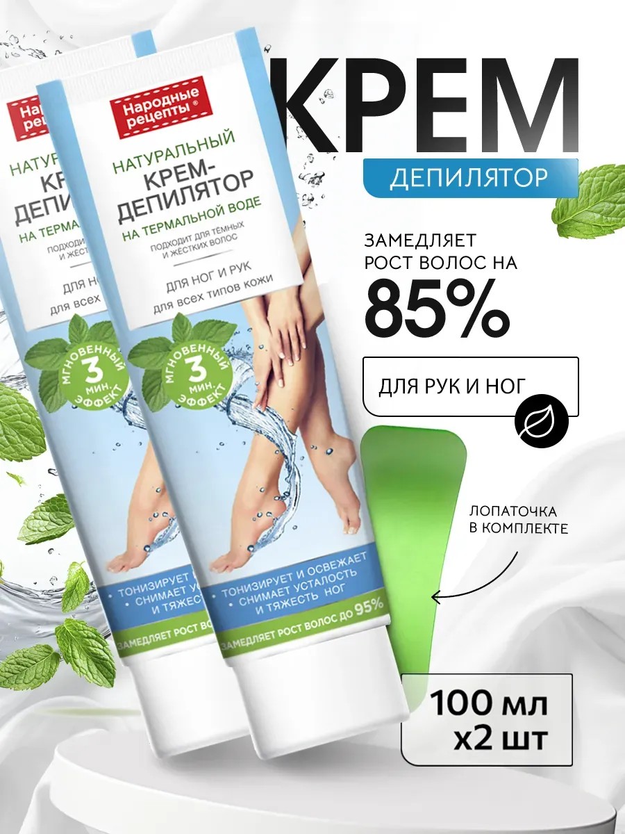 Уникальный крем-депилятор на основе термальной воды, обогащенный максимальной концентрацией натуральных, проверенных временем компонентов, быстро, эффективно и безопасно удаляет нежелательные волосы, надолго оставляя кожу нежной и гладкой. Впервые крем-депилятор одновременно удаляет нежелательные волосы и снимает усталость ног и рук. Входящее в состав натуральное масло мяты мгновенно снимает усталость, экстракт конского каштана тонизирует, оздоравливает и укрепляет, экстракт огурца глубоко увлажняет, освежает и восстанавливает кожу. При регулярном применении крема рост волос замедляется до 85% и Вы сможете наслаждаться безупречно гладкой кожей до 15 дней без риска вросших волос! Крем для депиляции от Фито Косметик / Fito косметик — это идеальное средство для эффективного удаления нежелательных волос на теле - ногах, руках. Этот продукт специально разработан для женщин и девушек, стремящихся к легкости и безболезненности процедуры. Формула крема включает питательные компоненты, которые ухаживают за кожей во время депиляции. Идеально подходит для удаления как жестких, так и темных волос. Крем увлажняющий, что особенно важно для чувствительной кожи. Он помогает предотвратить раздражения и покраснения. Крем обладает тонизирующими свойствами, которые помогают снять усталость рук и ног. Регулярное использование этого депилятора помогает замедлить рост новых волос благодаря специальной формуле, которая делает их более мягкими и тонкими. Это особенно полезно для девушек и подростков, которым важно поддерживать красивый внешний вид. Выбирая набор кремов для депиляции НАРОДНЫЕ РЕЦЕПТЫ, вы дарите своей коже увлажнение и заботу, оставаясь уверенной в качестве и профессионализме продукта. Подходит для всех возрастов и типов кожи, этот крем является настоящей находкой в мире красоты и ухода. Откройте для себя новый уровень комфорта и уверенности с ФитоКосметик — наслаждайтесь натуральной косметикой, которая заботится о вашей коже и облегчает процесс депиляции!