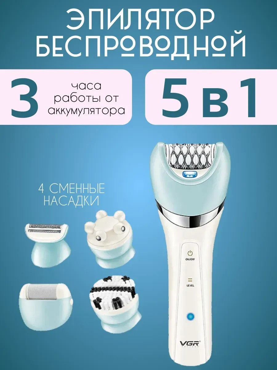 ВНИМАНИЕ! Включение, выключение и изменение скорости осуществляется двойным нажатием кнопки! Женский эпилятор- депилятор станет вашим незаменимым помощником в борьбе с нежелательными волосами на теле. Вот почему электрический набор 5 в 1 — это ваш идеальный выбор: 1. Профессиональный электроэпилятор, использующий передовые технологии, обеспечивает гладкую депиляцию даже на самых чувствительных участках кожи, таких как бикини, подмышки и ноги. Вы получите идеально гладкую кожу без боли, раздражений и вросших волос. В комплект входит насадка для удаления волос, позволяющая эффективно справляться даже с самыми тонкими и короткими волосками. 2. Роликовая пилка для пяток подарит вашим ступням нежность и мягкость. С помощью этого аппарата для педикюра вы легко избавитесь от мозолей и шероховатостей. Всего несколько движений — и ваши пятки будут невероятно гладкими и ухоженными. 3. Массажер для лица обеспечит вашей коже максимальный уход. Вы сможете расслабиться и насладиться ароматическим массажем, улучшая микроциркуляцию и подтягивая контуры лица. 4. Щетка для умывания позволит вам провести глубокую очистку кожи, избавляясь от излишков кожного жира и загрязнений. Ваша кожа будет свежей и сияющей после каждого использования. 5. Триммер с шейвером для бритья поможет вам легко и аккуратно придавать нужную форму и длину волосам на любых участках тела. С женской электробритвой вы всегда будете уверены в своем стиле и ухоженном внешнем виде. Благодаря компактному размеру и легкому весу, его удобно брать с собой в путешествия. Уникальный набор VGR 5 в 1 — идеальный выбор для тех, кто хочет наслаждаться гладкой и ухоженной кожей без визитов в салон красоты. Это отличный подарок как для себя, так и для ваших близких. Попробуйте его сегодня и оцените результаты уже завтра!
