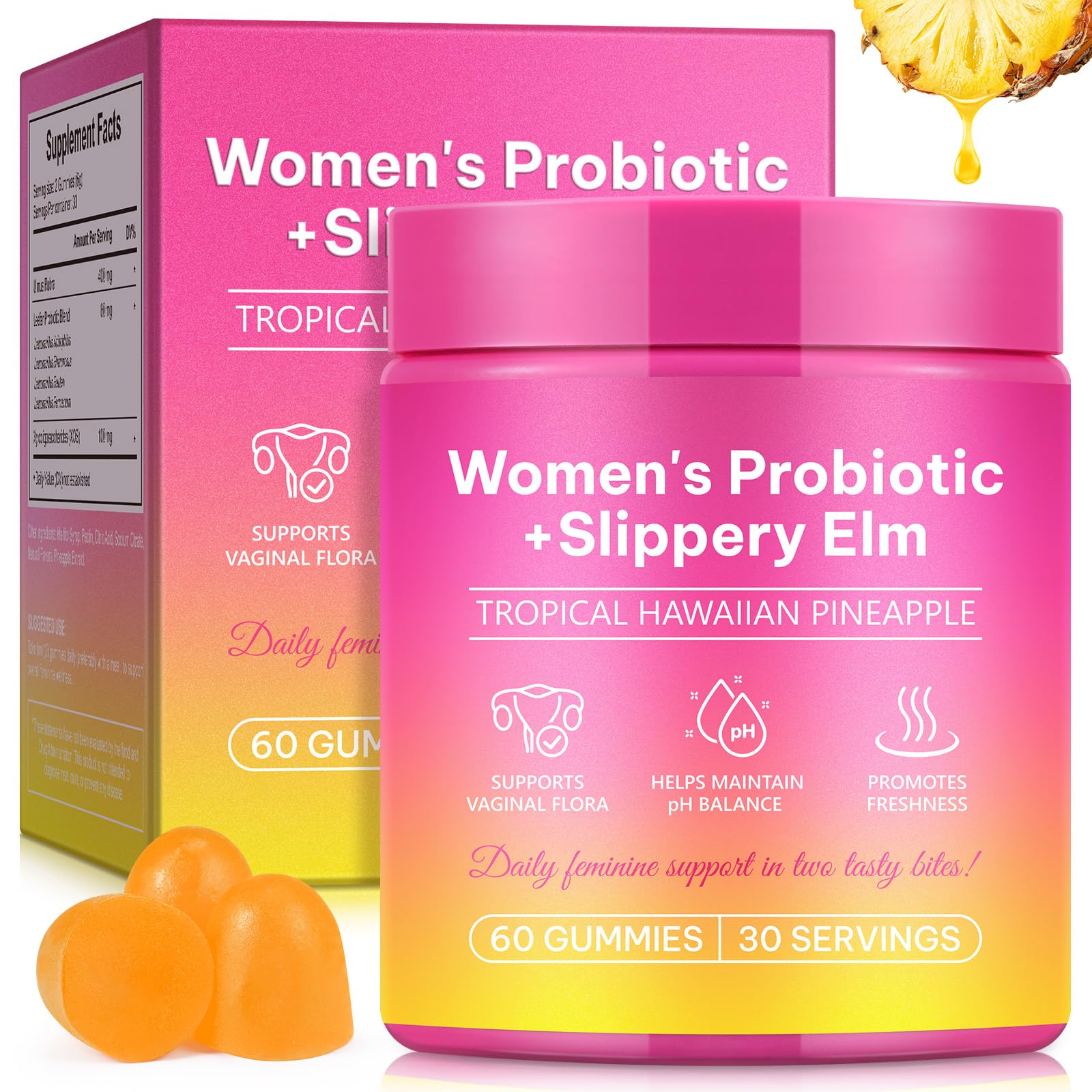 CONVENIENT, EASY TO USE: Vegan friendly, non-GMO, gluten-free! These tasty, sugar-free formula pineapple-flavored gummies offer a simple, enjoyable way to support your intimate and overall health—just chew two gummies daily for a 30-day supply. Perfect for busy women on the go who want effective care without the hassle. SUPPORT GUT HEALTH IMMUNITY: Along with probiotics, these slippery elm gummies for women also feature XOS prebiotic to deliver dual benefits by enhancing gut flora balance, aiding digestion, and boosting immune function. A healthy gut means a healthier you—inside and out. IMPROVE ODOR HYDRATION: Say goodbye to embarrassing odor! Slippery Elm (400mg per serving) soothes and supports natural moisture, while probiotics help reduce odor for lasting confidence without the need for harsh chemicals or douches. MAINTAIN PH BALANCE: These feminine probiotic gummies help to maintain vaginal pH levels, creating a natural defense against irritation and discomfort. By promoting an optimal acidic environment, they contribute to a healthier, more resilient intimate ecosystem. SUPPORT VAGINAL HEALTH: Our women's probiotic slippery elm are specially formulated with probiotic strains like Lactobacillus rhamnosus and Lactobacillus reuteri to help maintain a healthy vaginal flora, vaginal odor control, pH regulation and yeast balance, supporting overall feminine wellness and comfort for women of all ages.