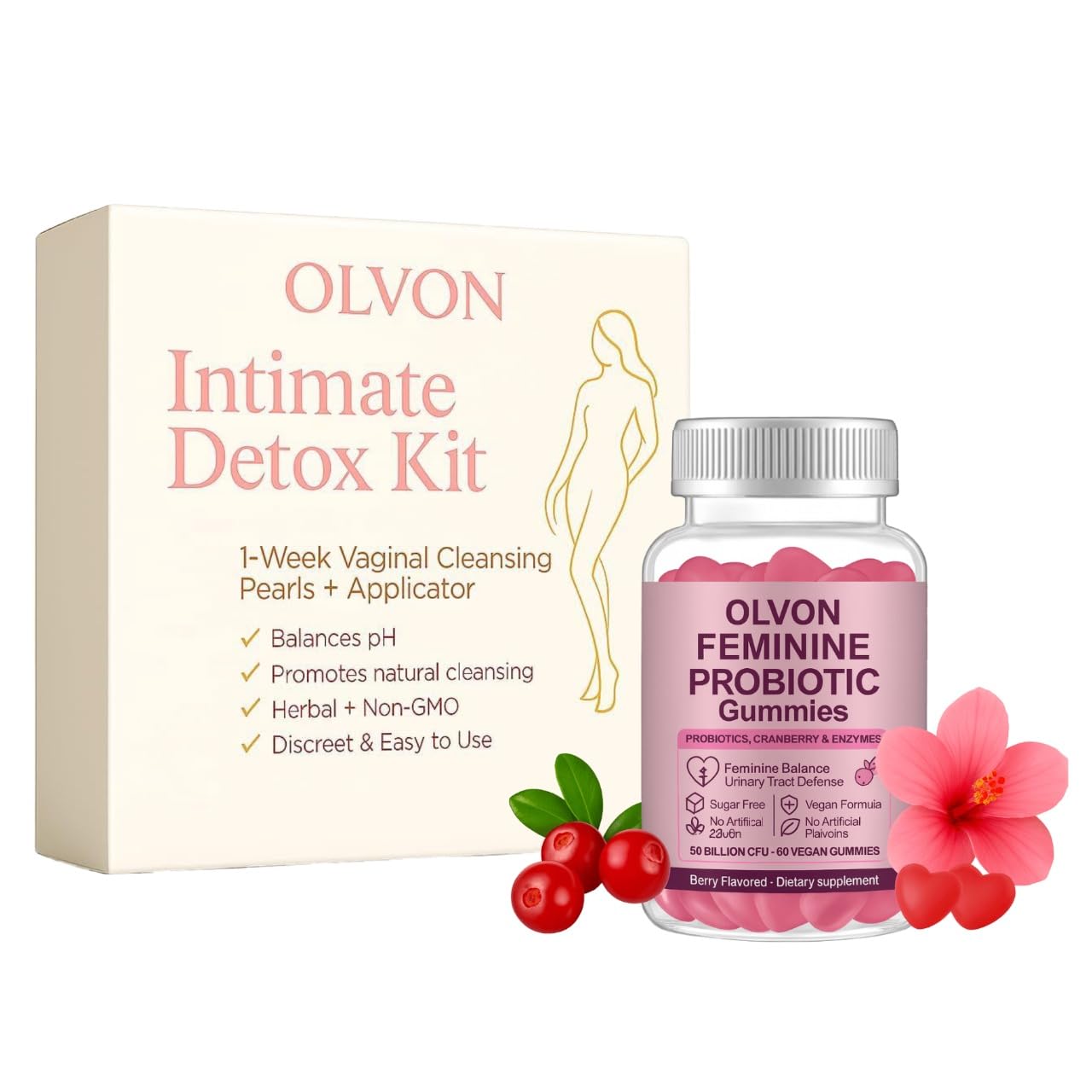 Support your feminine wellness from the inside out with the OLVON Feminine Wellness Bundle, a complete system designed to promote comfort, freshness, balance, and confidence. This bundle includes two powerful products working together: The OLVON Intimate Detox Kit, a 1-week herbal cleansing system created to support natural freshness and help maintain pH balance. The OLVON Feminine Probiotic Gummies, formulated with 50 Billion CFU of probiotics, cranberry, and enzymes to support vaginal balance and urinary tract wellness. This two-step system provides both internal microbiome support and gentle herbal cleansing for comprehensive feminine wellness. The gummies are crafted with clean, premium ingredients—vegan, sugar-free, non-GMO, and free from artificial flavors and colors. Perfect for daily support, monthly maintenance, or anytime you want to feel renewed, balanced, and confident.✓ Easy, Discreet Delicious: The detox kit is quick, simple, and discreet to use. The berry-flavored gummies make daily feminine support enjoyable and effortless. ✓ Premium Formula — Vegan, Sugar-Free Non-GMO: Gummies are 100 vegan, sugar-free, and formulated without artificial colors or flavors. Detox pearls contain natural herbal ingredients to support gentle cleansing. ✓ Urinary Tract Feminine Defense: Formulated with cranberry, probiotics, and enzymes to help support urinary tract wellness and feminine balance. ✓ Supports pH Balance Natural Freshness: Herbal cleansing pearls help promote intimate freshness and odor balance, while probiotics help maintain a healthy vaginal microbiome and feminine comfort. ✓ Complete Feminine Wellness System: Includes a 1-Week Intimate Detox Kit plus 50 Billion CFU Feminine Probiotic Gummies for total feminine support—gentle cleansing daily microbiome balance in one complete bundle.