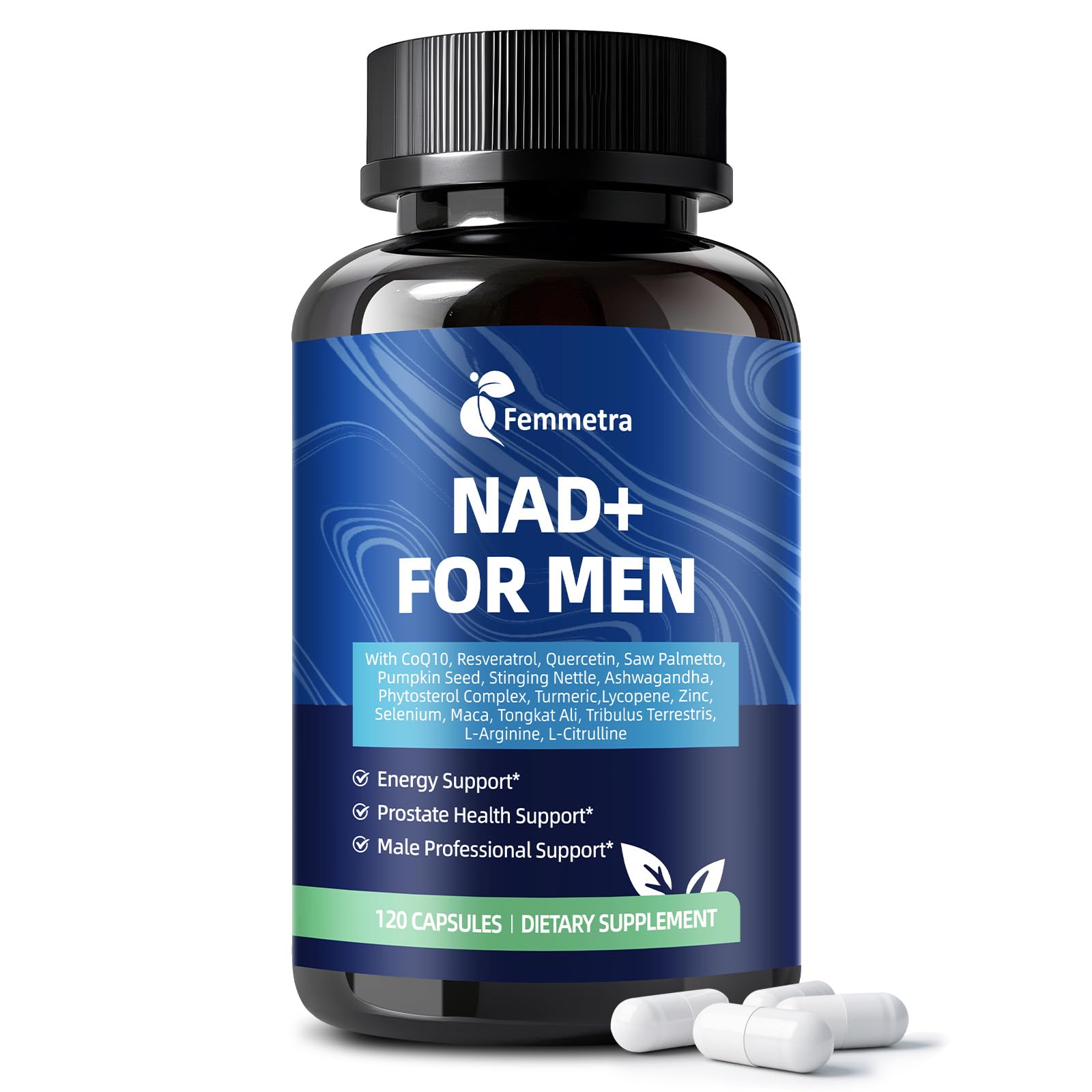 Maximum Absorption, No Hassle: NAD in One Daily Capsule - Experience advanced delivery with black pepper extract, which are included to support superior nutrient absorption and bioavailability. This non-GMO, all-in-one capsule is your simple, yet powerful daily choice for sustained energy and comprehensive well-being. Why Take Multiple Supplements? Get Our All-in-One "Energy Stack" - We combine a powerful trio—NAD , CoQ10, and resveratrol—that works synergistically to support mitochondrial function and cellular defense. Add in quercetin for added benefits. Simplify your daily routine without compromising on comprehensive support, and replace a cabinet full of bottles. Revive Your Natural Vigor Physical Performance - Femmetra male support blend includes key nutrients like zinc and selenium, plus tongkat ali, an herb known for its traditional use in supporting energy and vitality. This synergistic formula is designed to help enhance your body's natural vigor, boost stamina, and maintain your drive for an active lifestyle. For Men Over 40: Proactive Prostate Urinary System Support - Don't just wait and worry. Our targeted 400mg Prostate Complex with saw palmetto, pumpkin seed, and lycopene is scientifically crafted to support normal prostate function and promotes healthy urinary flow. Support your long-term wellness and enjoy peace of mind for the years ahead. Feel Your Energy Focus Slipping? Recharge at The Cellular Level - Fight feelings of fatigue and support mental clarity with Femmetra advanced NAD , a key coenzyme for cellular energy production and renewal. This formula is designed to help you feel more mentally sharp and physically revitalized to power through your demanding days and stay active.