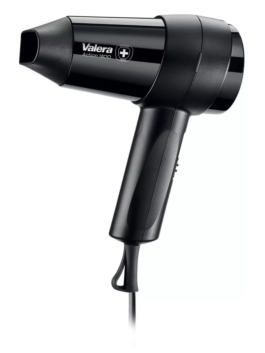 A compact hair dryer with a classic design and an elegant black body. 1800-watt power. It features 3 speed and temperature settings, including a cool shot function.