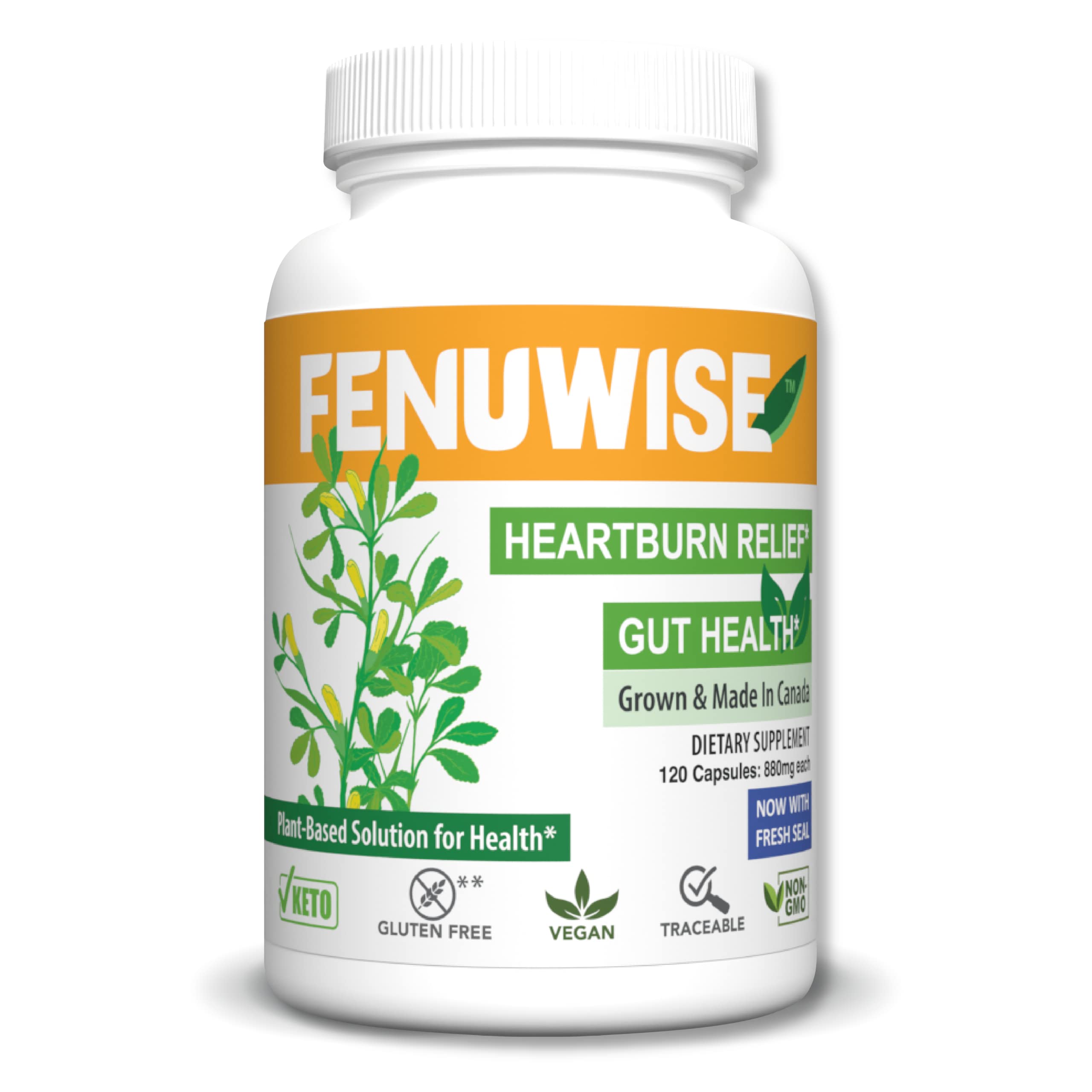 Fenuwise Natural Heartburn Relief Fenugreek Fiber Supplement, Plant-Based Fenugreek Seed Derived Soluble Fiber, Traceable to the Farm (120 Capsules), Safe Effective Indigestion Acid Relief, Vegan