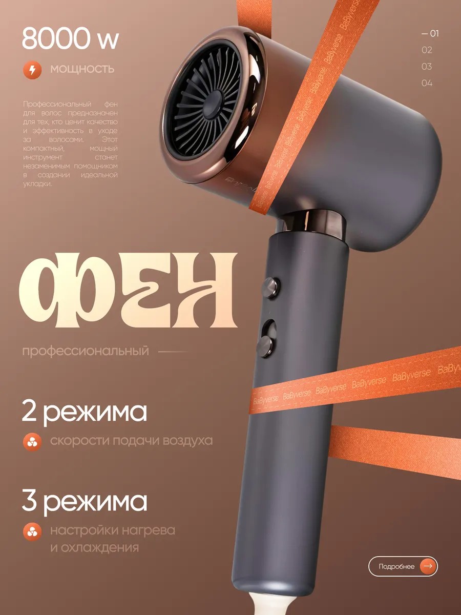 Модель отличается компактным маленьким размером, что делает ее идеальным выбором для путешествий или использования в ограниченном пространстве. Маленький фен удобно брать с собой, он легко помещается в дорожной сумке. Этот фен для волос предназначен как для домашнего использования, так и для профессиональных парикмахерских, что делает его универсальным инструментом для всех.